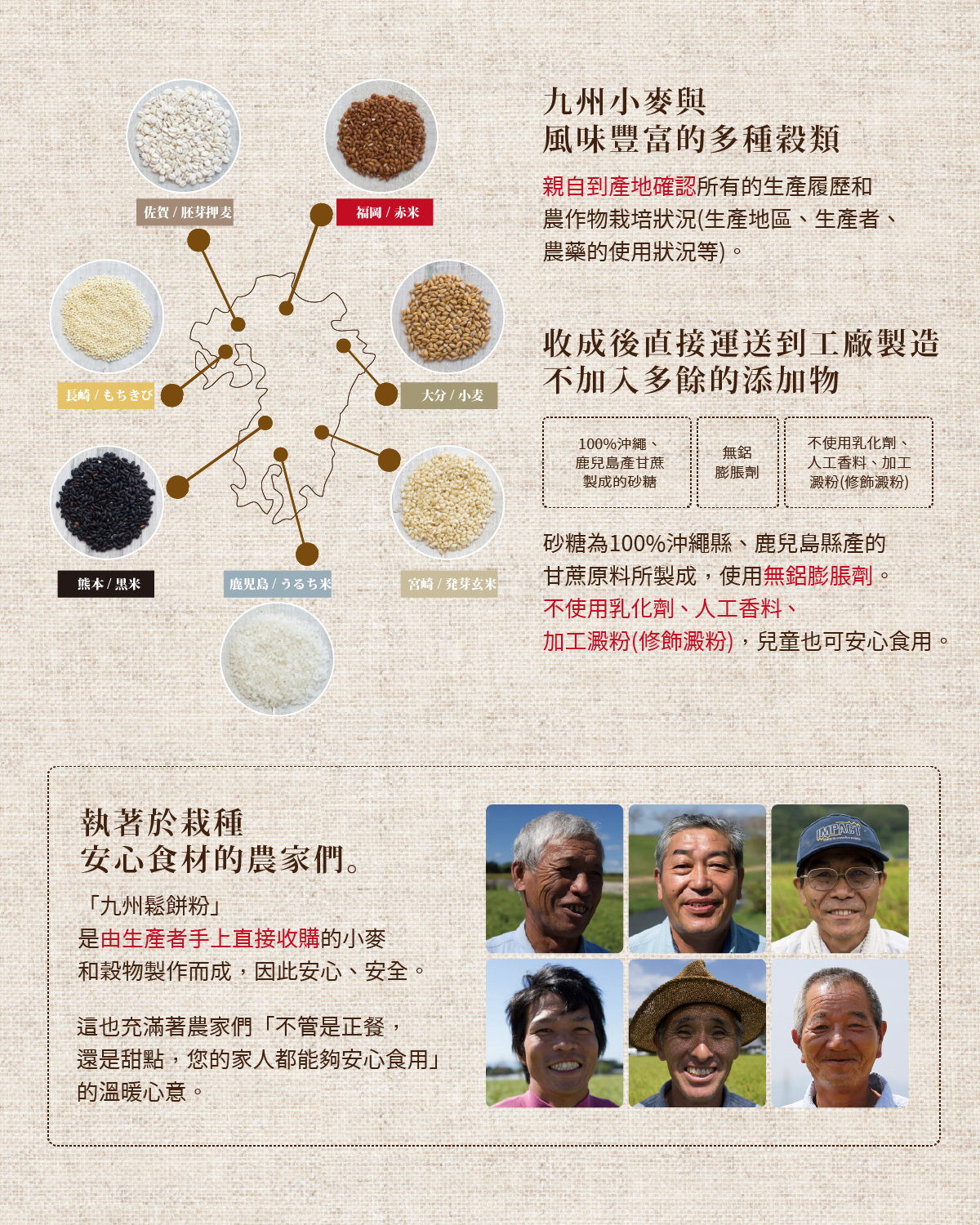 嚴選九州特色七種穀物,小麥粉(大分和其它九州縣市)、黑糖(沖繩)、紅糯米(福岡)、胚芽押麥(佐賀)、糯黍(長崎)、紫米(熊本)、粳米(鹿兒島)、發芽玄米(宮崎)。#有可能依季節、氣候調整九州內產地。
