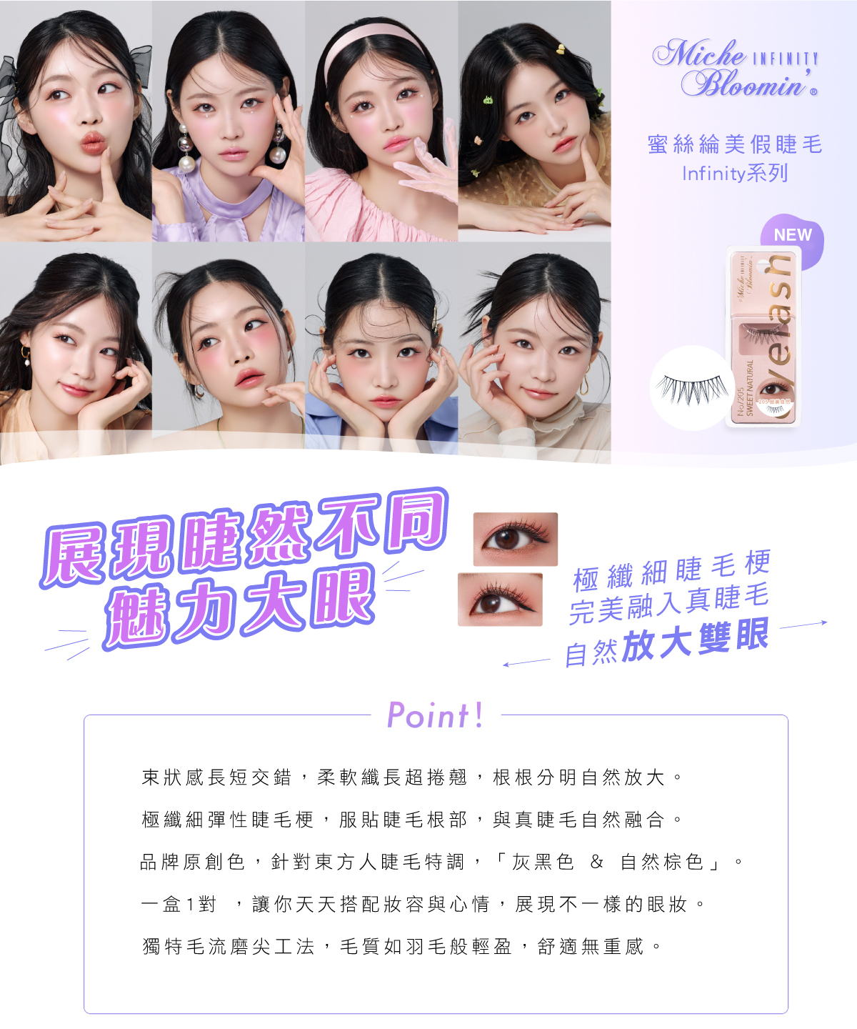 特點:用根根分明的睫毛打造無辜可愛雙眸,交叉混和長短毛束,絕妙束感設計,輕鬆實現小臉童顏!