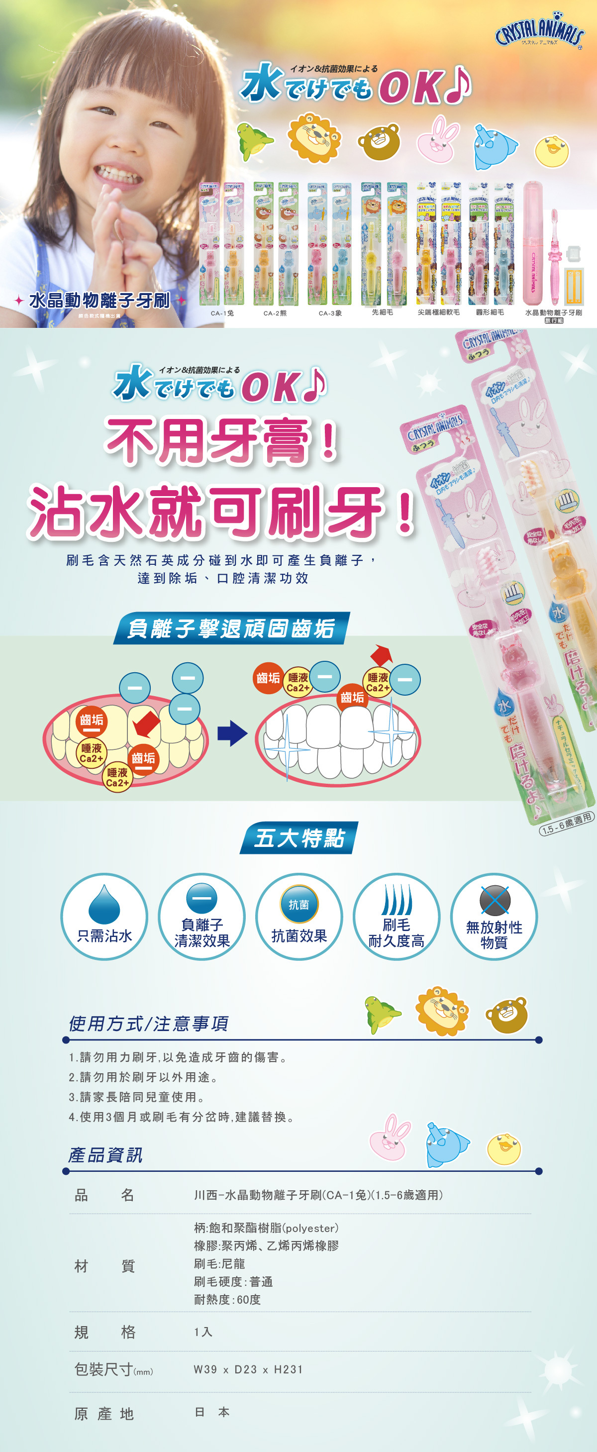 【品名】川西商事 水晶動物離子牙刷 (1.5歲以上適用) (兔/熊/象) 1入顏色隨機
