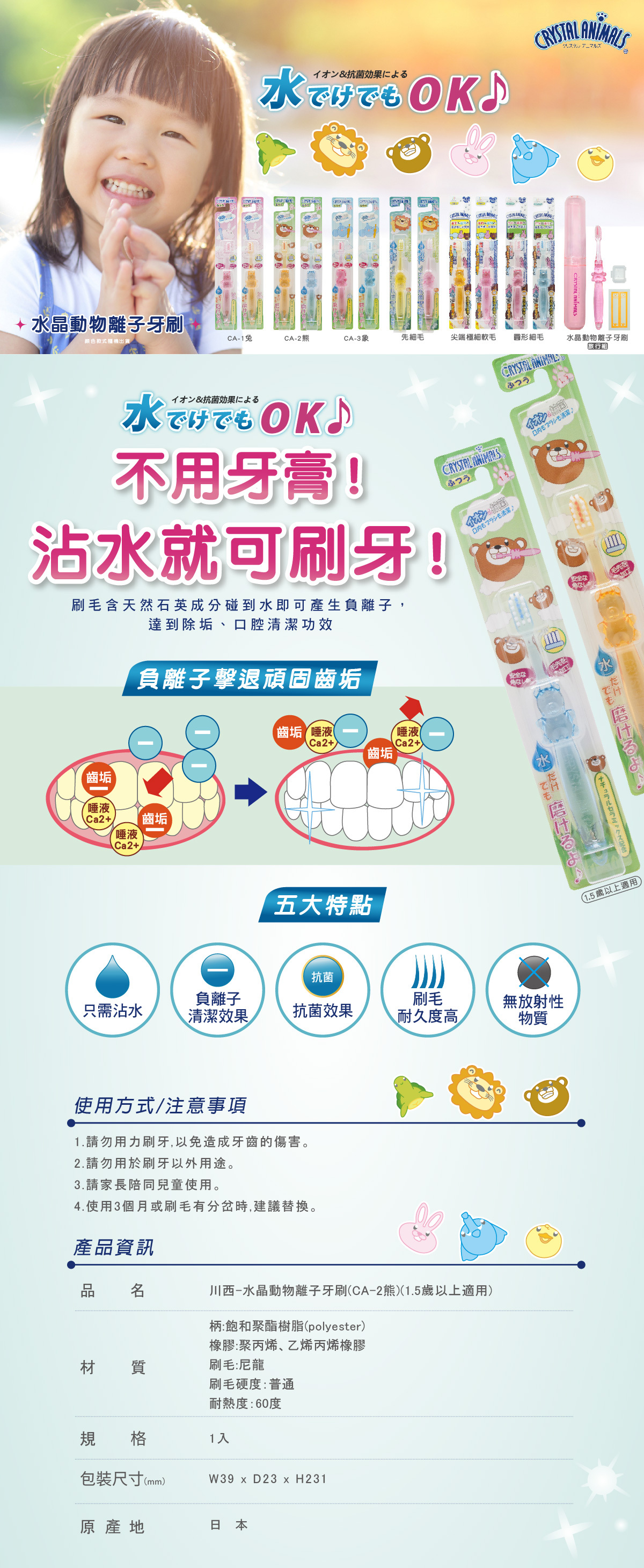 【品名】川西商事 水晶動物離子牙刷 (1.5歲以上適用) (兔/熊/象) 1入顏色隨機