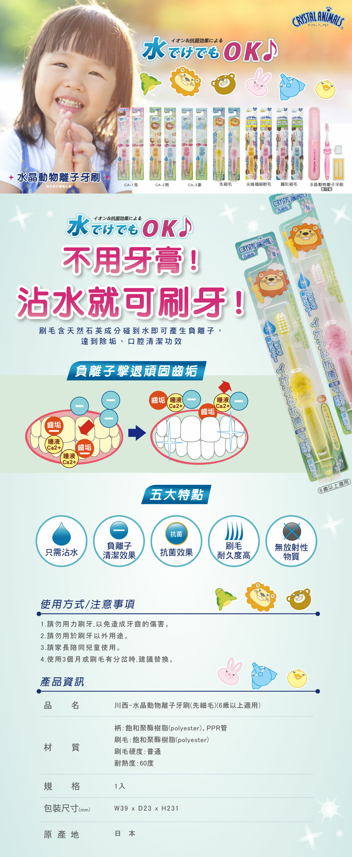 【品名】川西商事 水晶動物離子牙刷 (先細毛/尖端極細軟毛/圓形細毛)