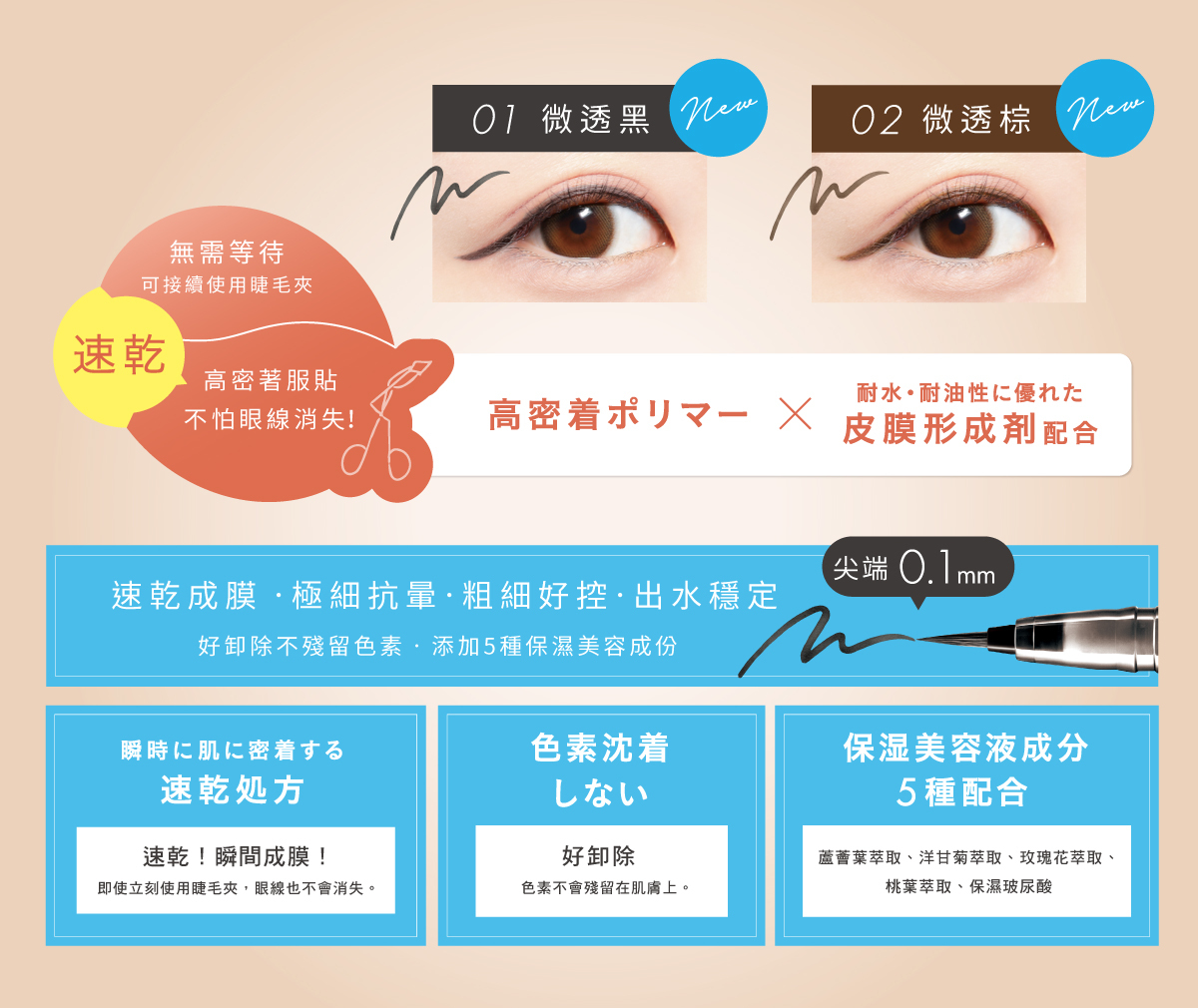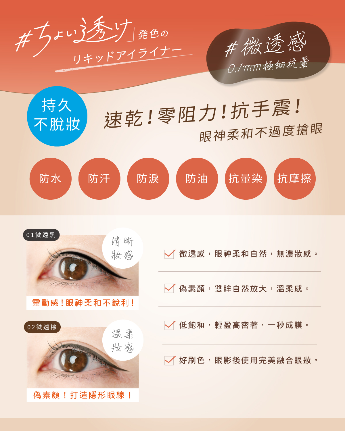 具有透明感的色澤,演繹自然脫俗雙眸.防水,防汗,抗皮脂,抗摩擦.速乾配方不易暈染. 0.1mm的極細筆尖,輕鬆勾勒完美線條.不易造成色素沉澱.含5種保濕美容成分.