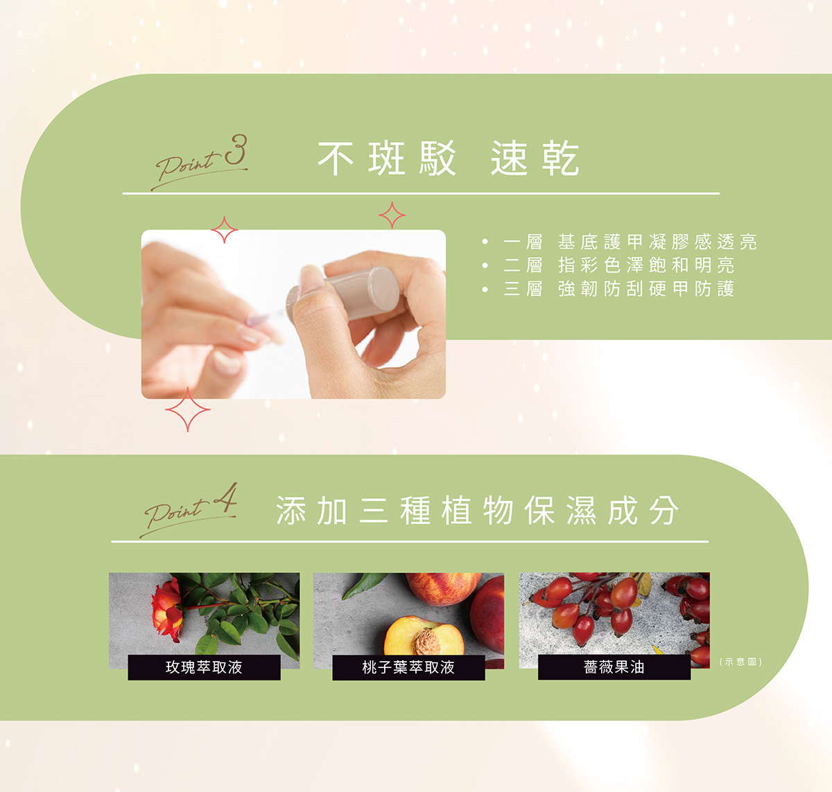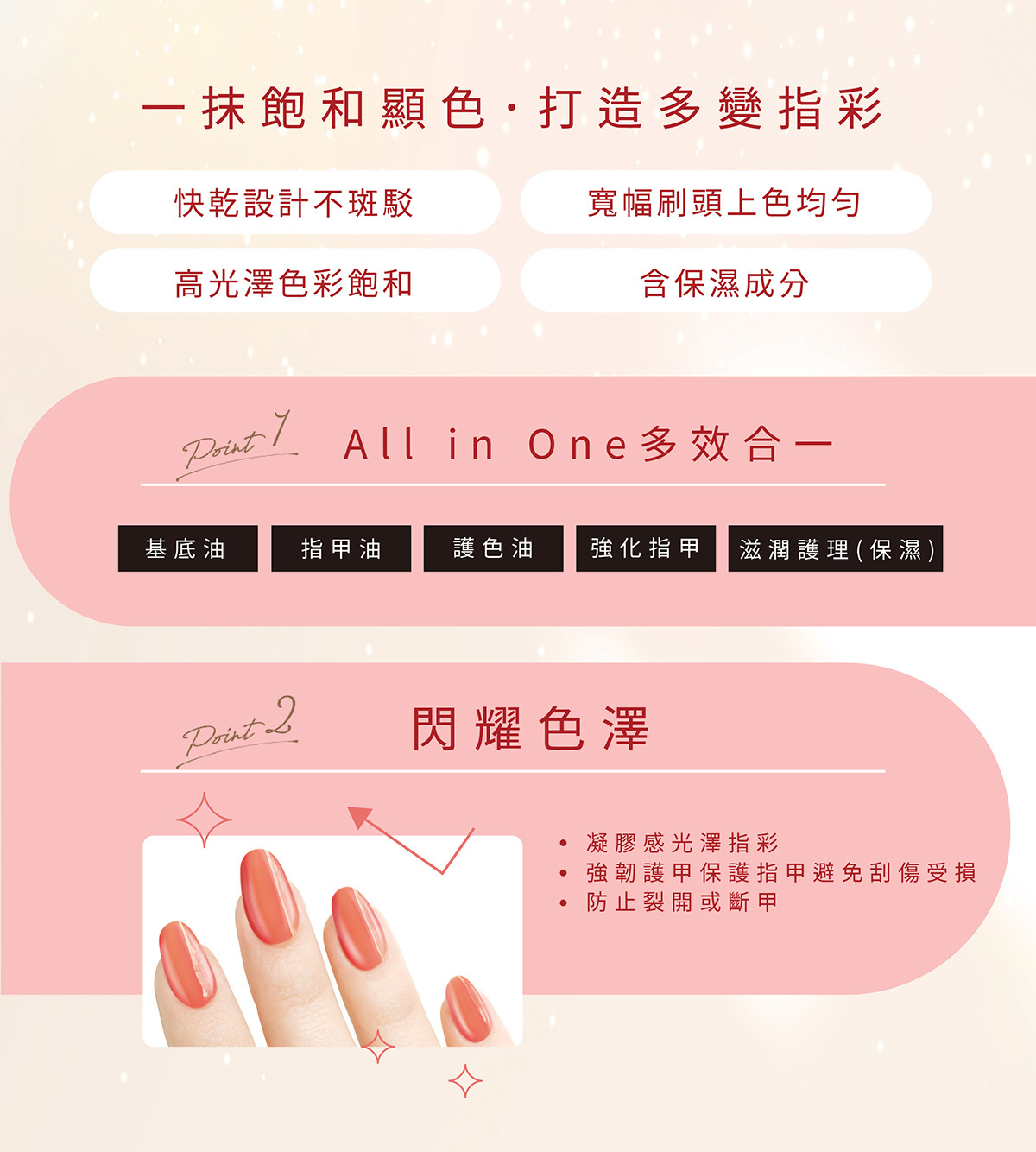 特點:指尖展現凝膠感光澤閃耀.五效合一:基底油,指甲油,護色油,強化指甲,滋潤護理.添加保濕成分:玫瑰萃取液,桃子葉萃取液,薔薇果油.