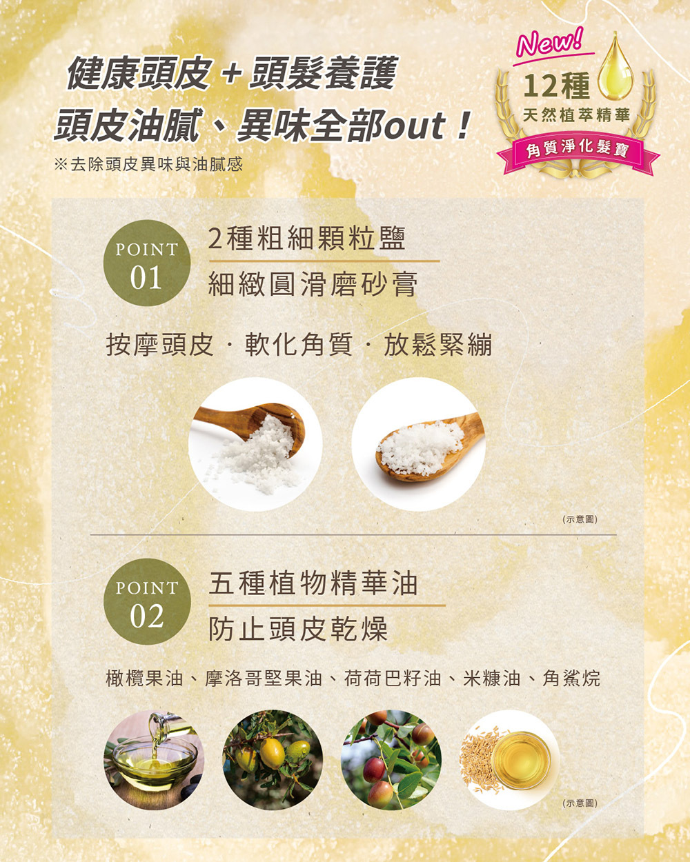 兩種不同大小的鹽類磨砂粒(氯化鈉),搭配按摩,舒緩頭皮緊繃。添加五種保濕成分,滋潤頭皮。