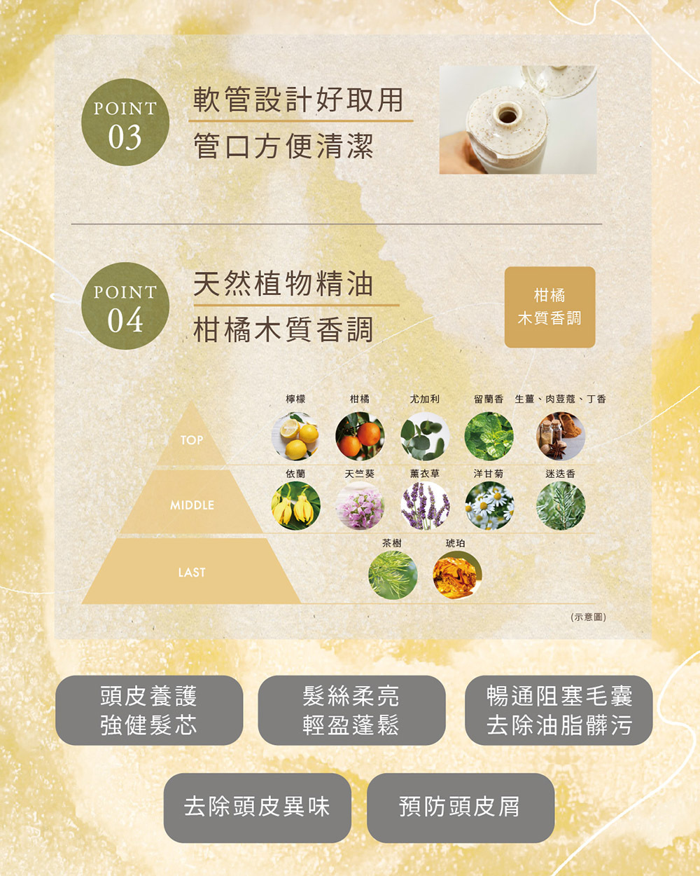 【特點】能夠去除洗髮精無法洗淨的毛孔污垢和皮脂,同時護理頭皮,散發清新舒適的柑橘和木質香氣。
