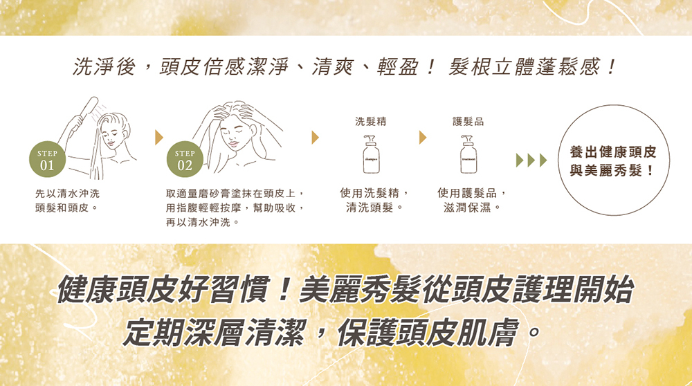 【使用方法】將頭髮和頭皮充分濕潤,取適量(約一個乒乓球大小)塗抹於頭皮,以指腹按摩頭皮後沖洗乾淨。使用後再使用洗髮精洗頭.建議每週使用1~3次。