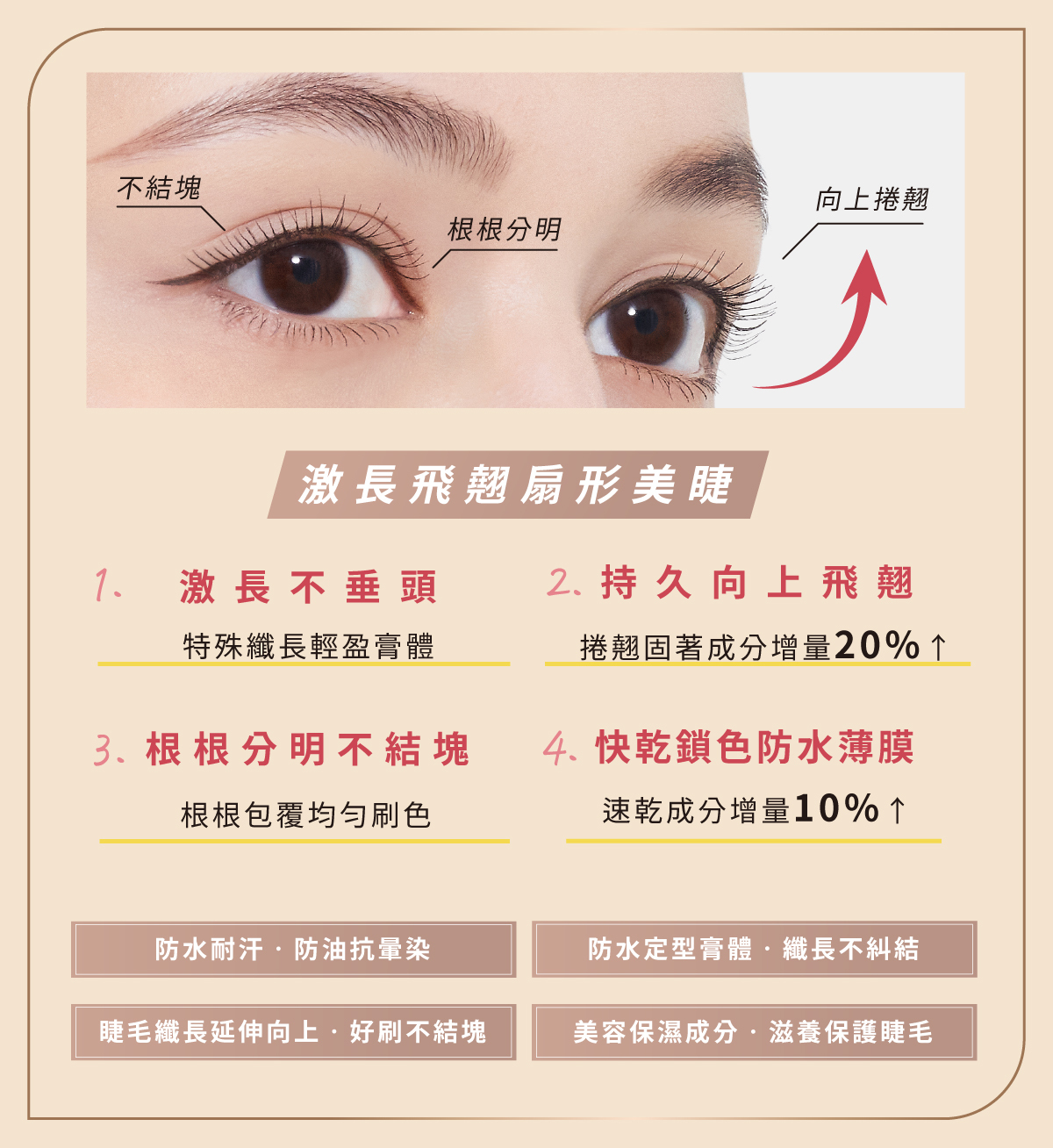 ・速乾配方,防水,防汗,抗皮脂.讓睫毛長時間保持捲翹