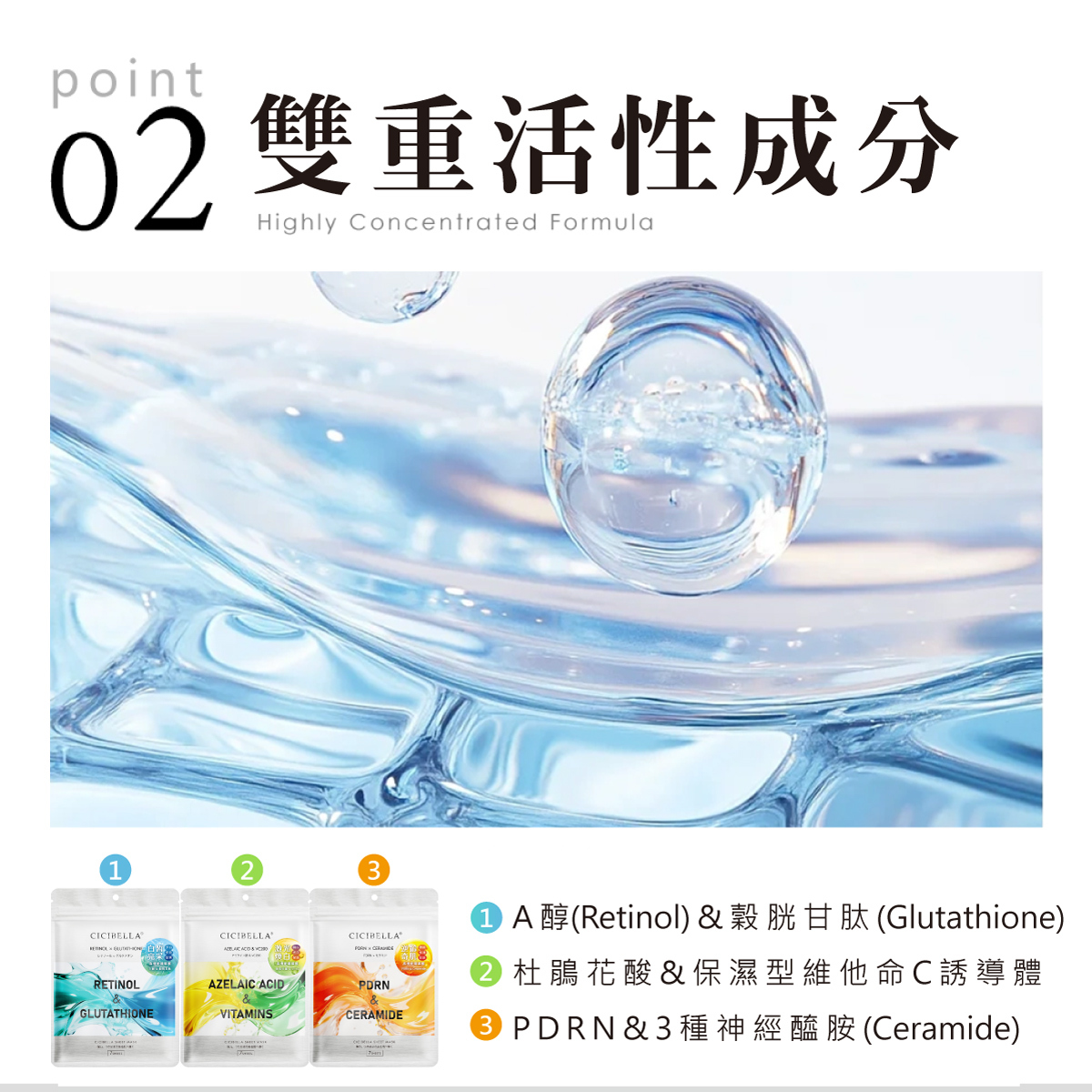 雙重活性成分,A醇x穀胱甘肽,淨白無瑕,水潤明亮,彈性緊實,