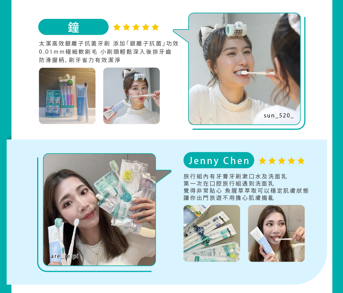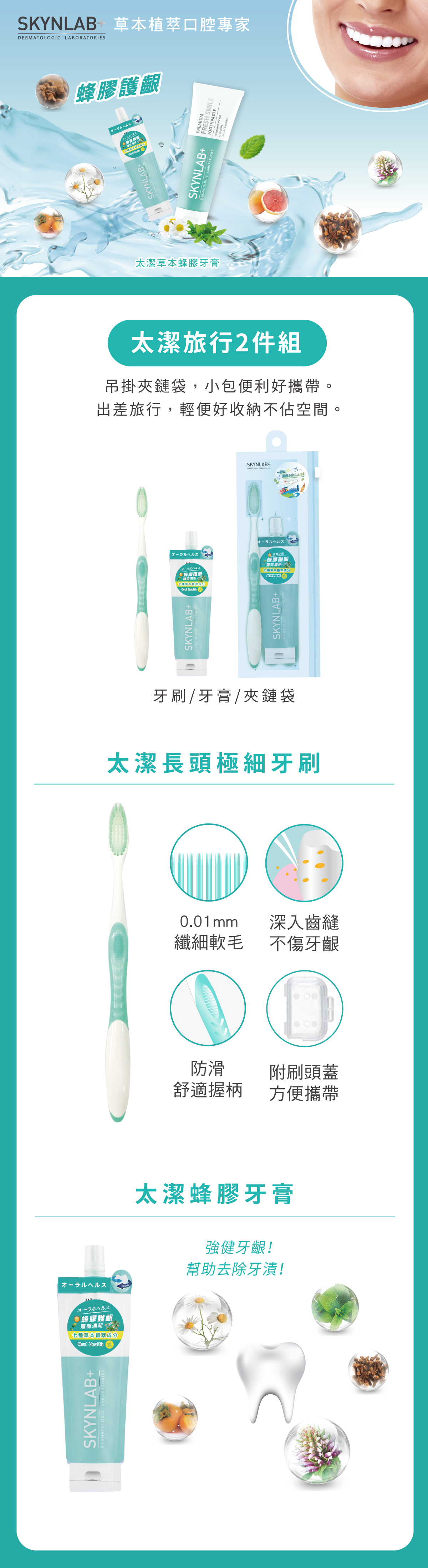 【特點】〔牙刷〕0.01mm纖細軟毛,有效清潔牙齒表面污垢。防手滑舒適握柄。附刷頭蓋。〔牙膏〕嚴選7種草本植萃成分,幫助牙齦護理,去除口腔異味,含蜂膠萃取,幫助去除牙菌斑。