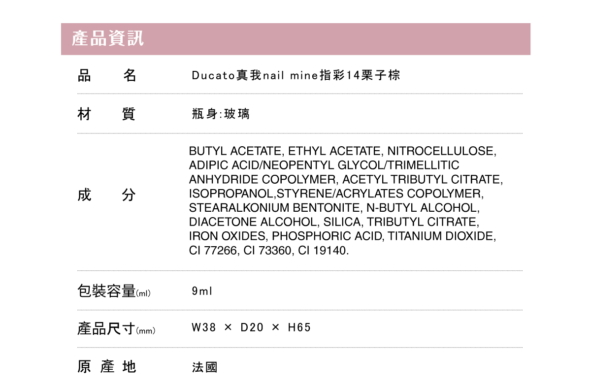 【產品名稱】DUCATO真我nail mine指彩14栗子棕