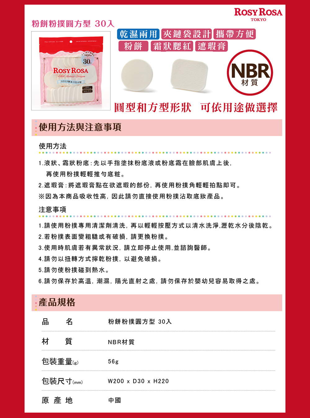 【產品名稱】ROSY ROSA 粉餅粉撲圓方型 30入
