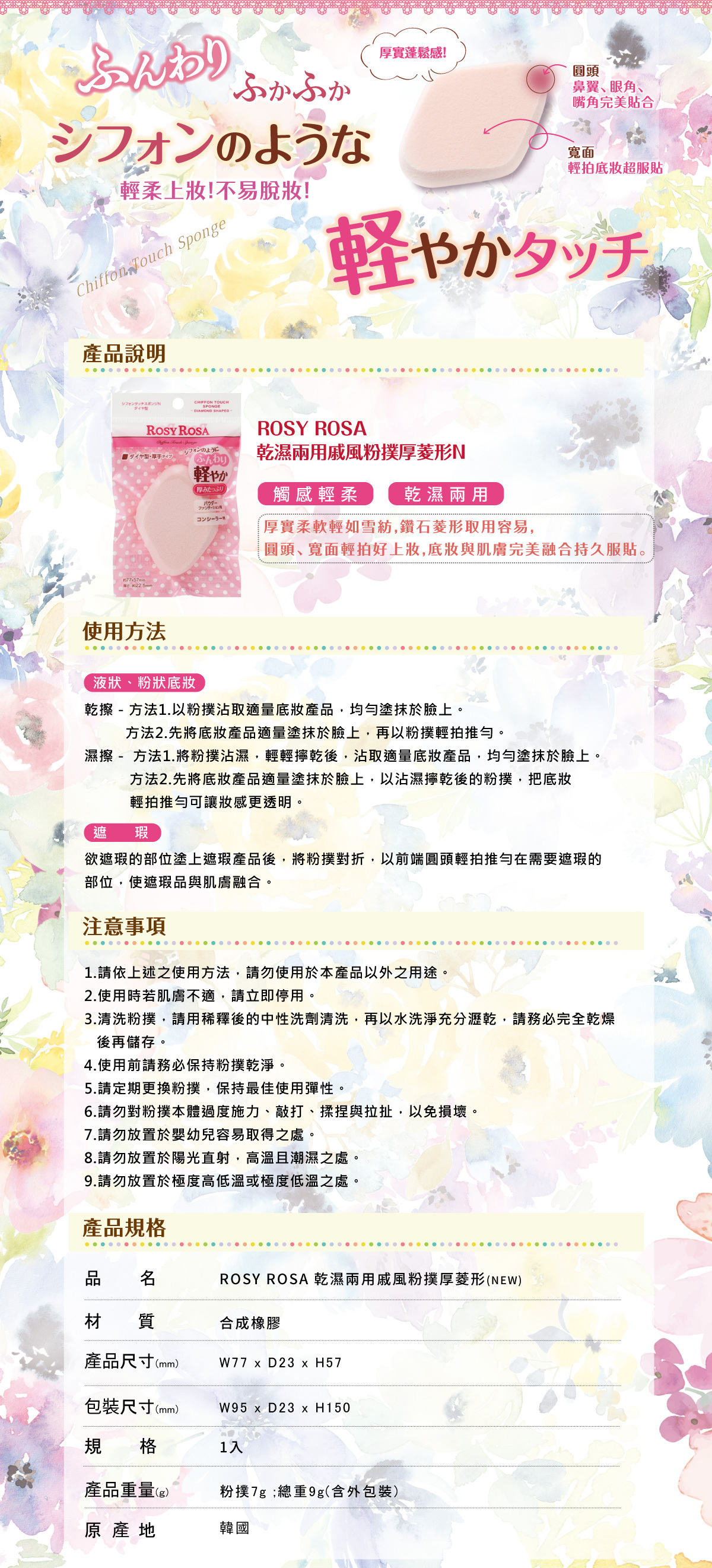 【品名】 ROSY ROSA 乾濕兩用戚風粉撲厚菱形N 1入