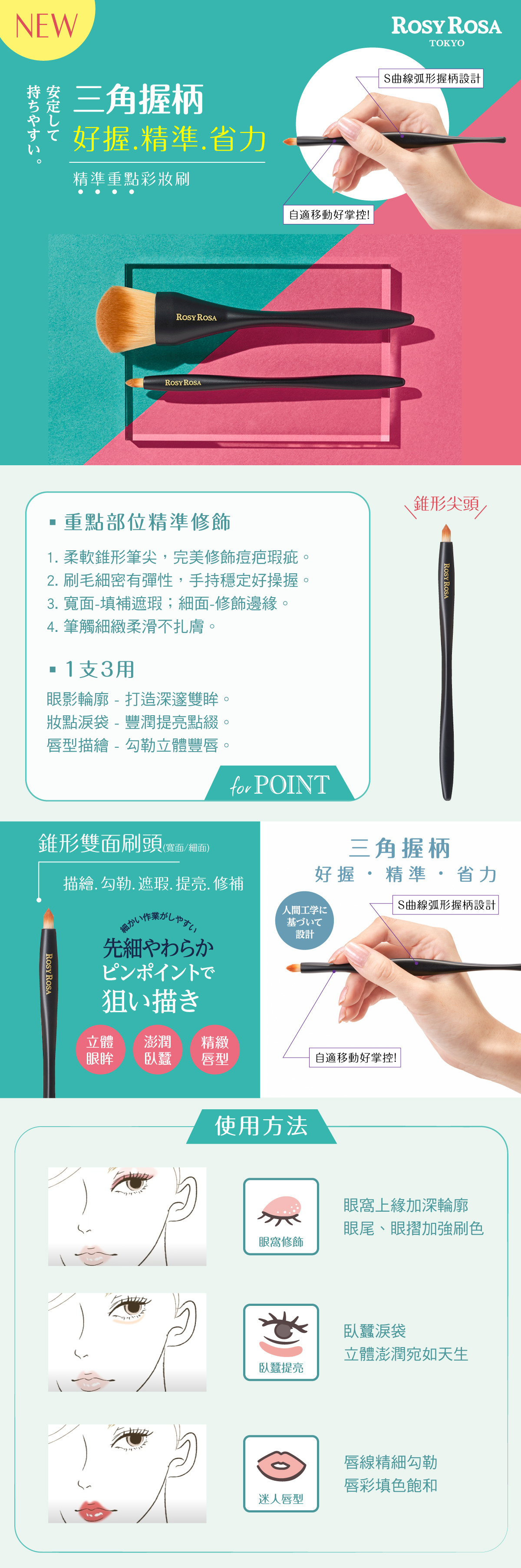 1支3效,眼影輪廓、妝點淚袋 、唇型描繪