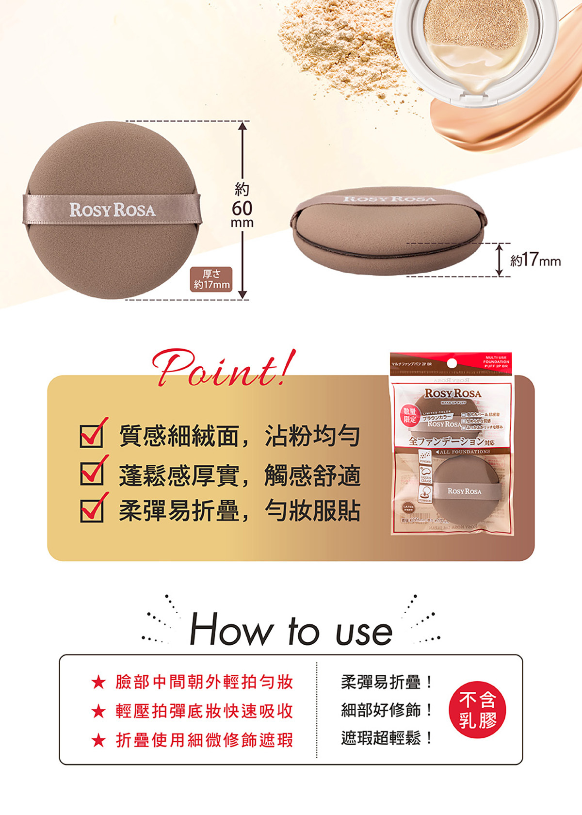 觸感滑順,適用粉餅、氣墊、液狀、霜狀和蜜粉所有類型粉底.粉撲厚實有彈性,輕鬆遮蓋毛孔將粉底融於肌膚,打造均勻細緻妝感.上妝補妝均適用,不含乳膠.