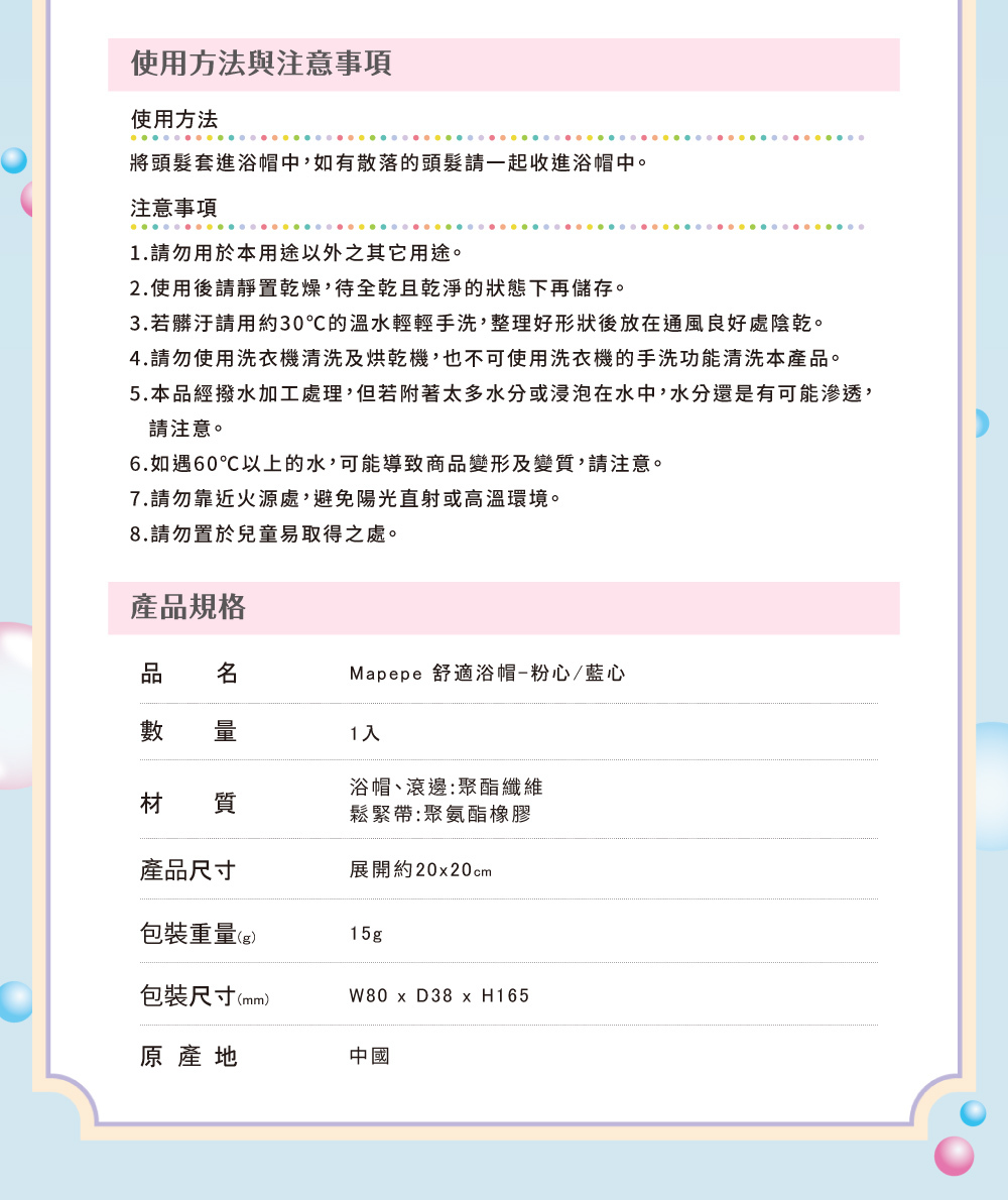 【產品名稱】Mapepe 舒適輕薄浴帽 1入