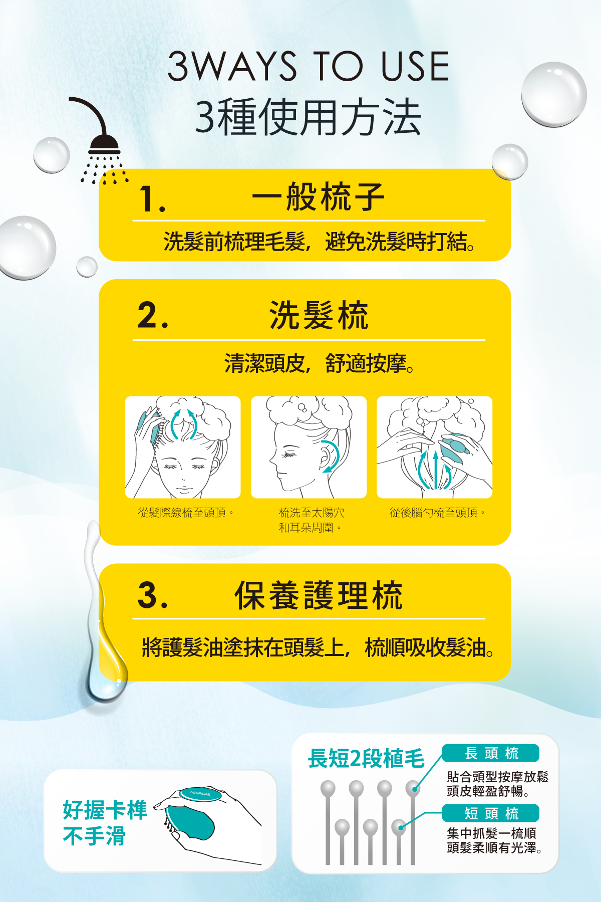 適合用於1.髮梳:洗髮前梳理.2.洗髮刷:清潔洗淨.3.護髮梳:塗完護髮素後梳理.