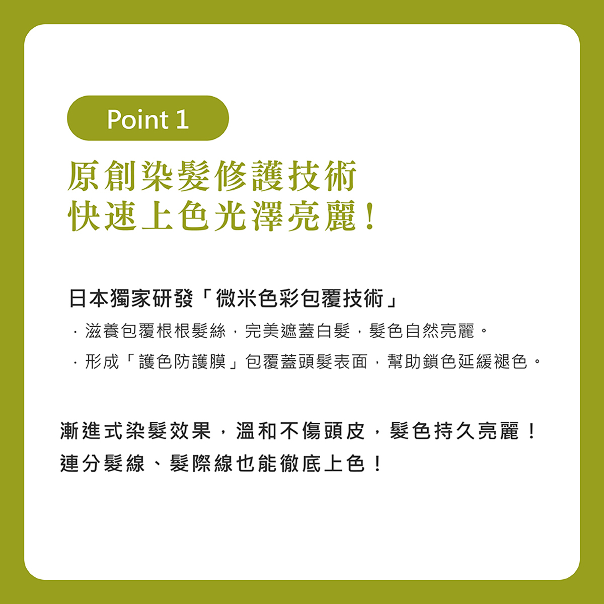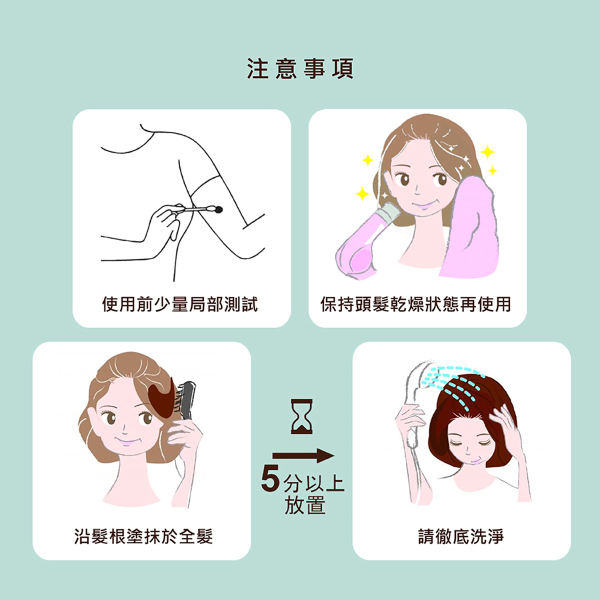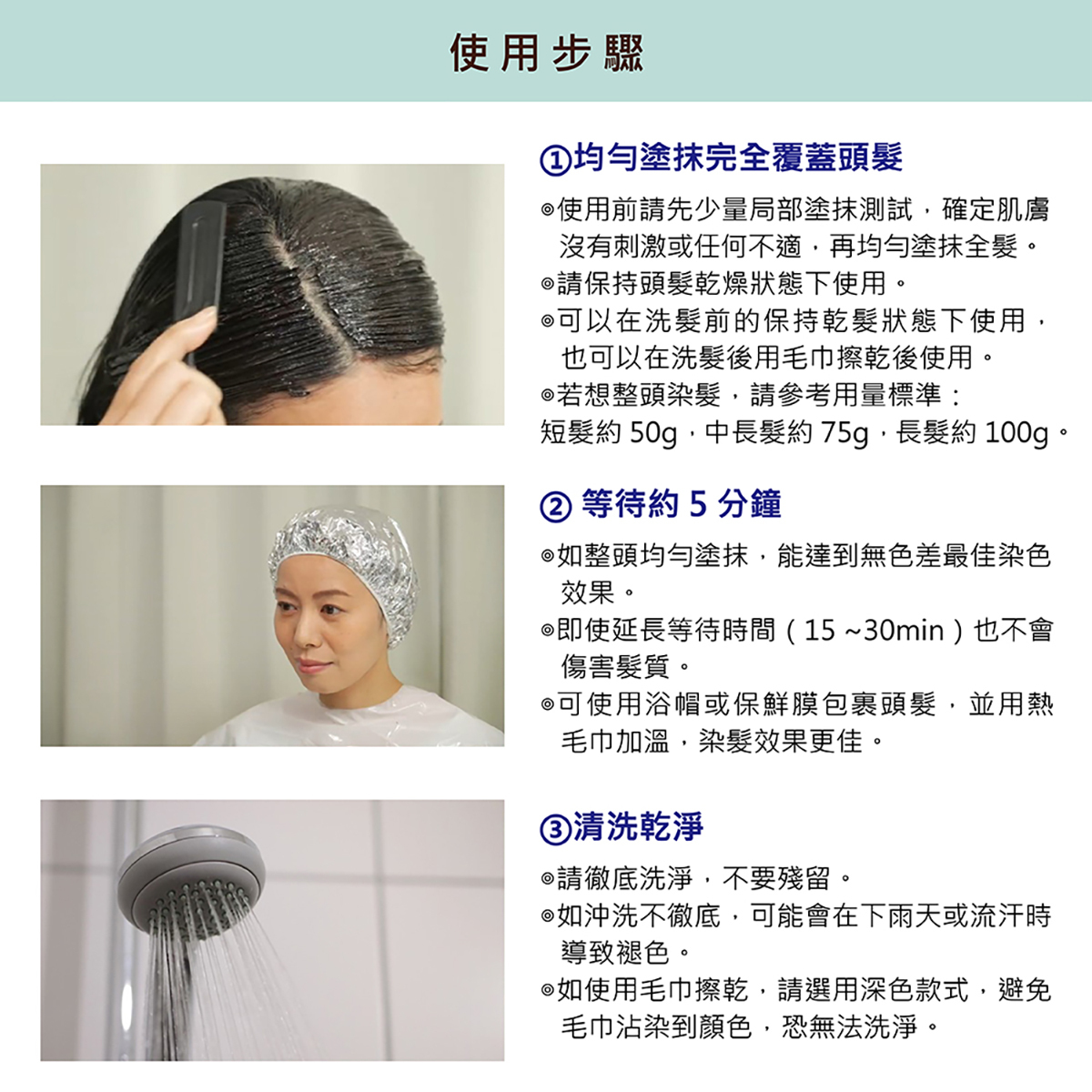 1.使用前請務必做皮膚塗抹測試,確定肌膚沒有刺激或任何不適,再均勻塗抹全髮。