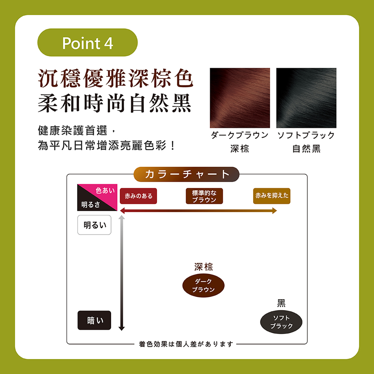 ※著色效果會因個人原髮色及髮質而有所差異,黑髮或深色髮無法染成淺色.
