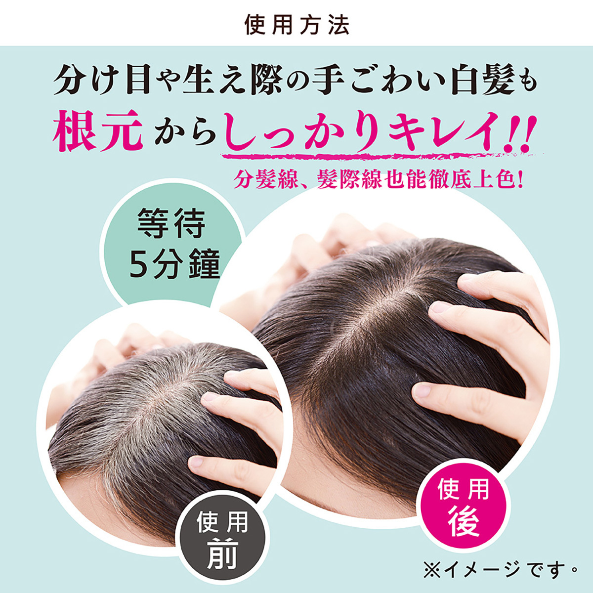 2.請保持頭髮乾燥狀態下使用,洗髮後先用毛巾將水分充分拭乾,徹底去除水分後,將產品以梳子或手均勻塗抹於整頭髮絲,特別是白髮部位。