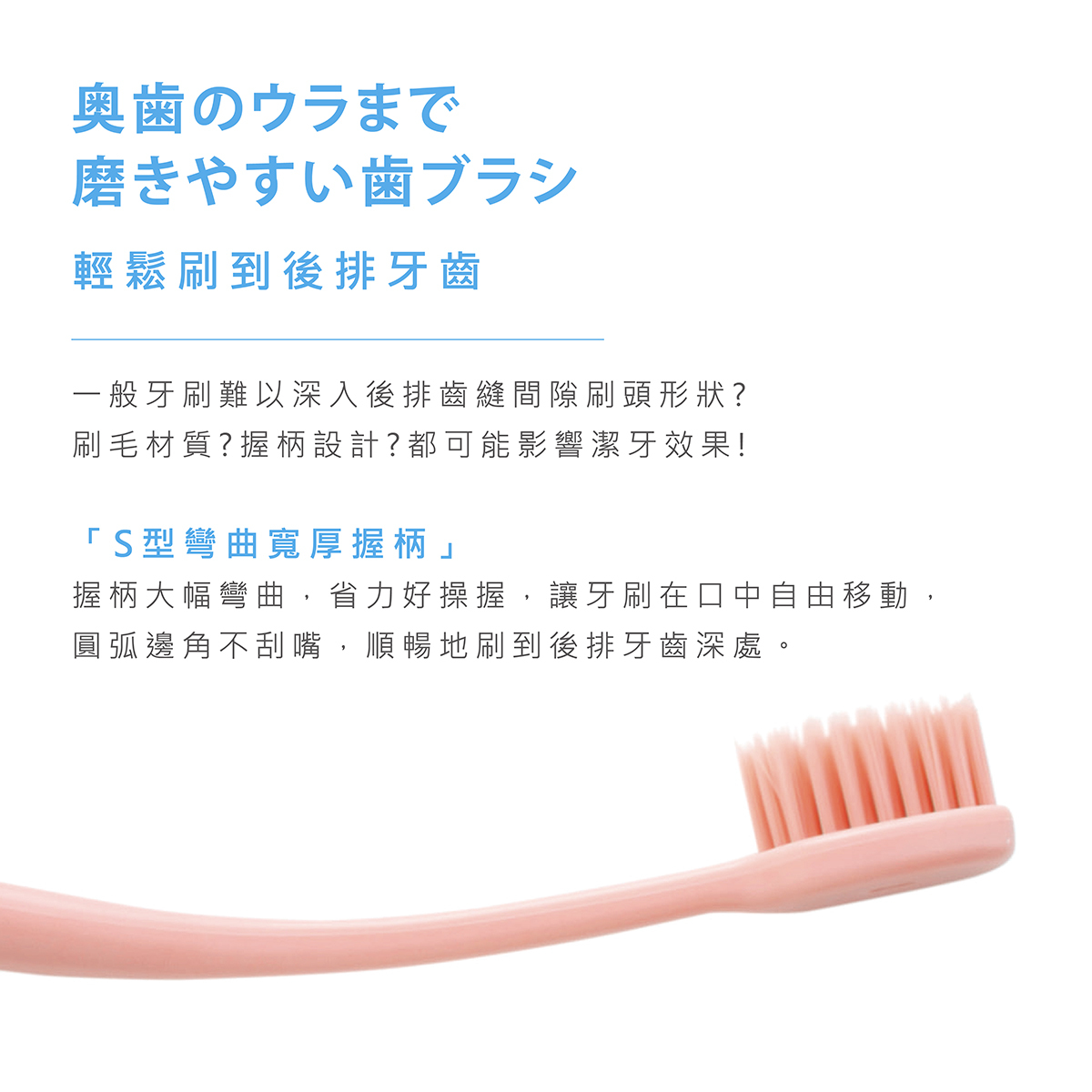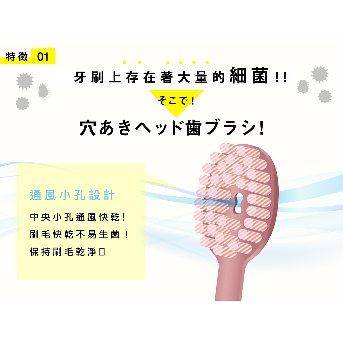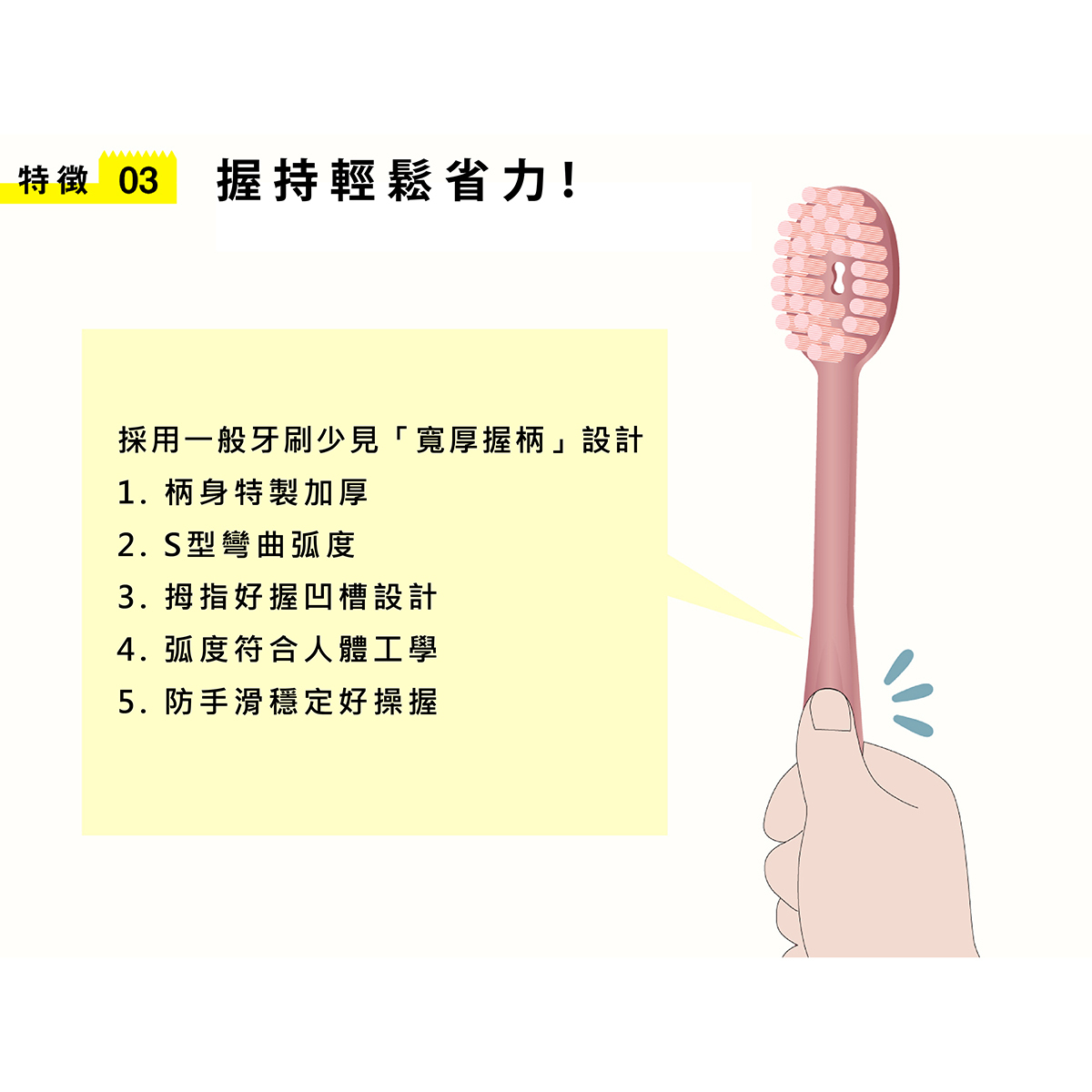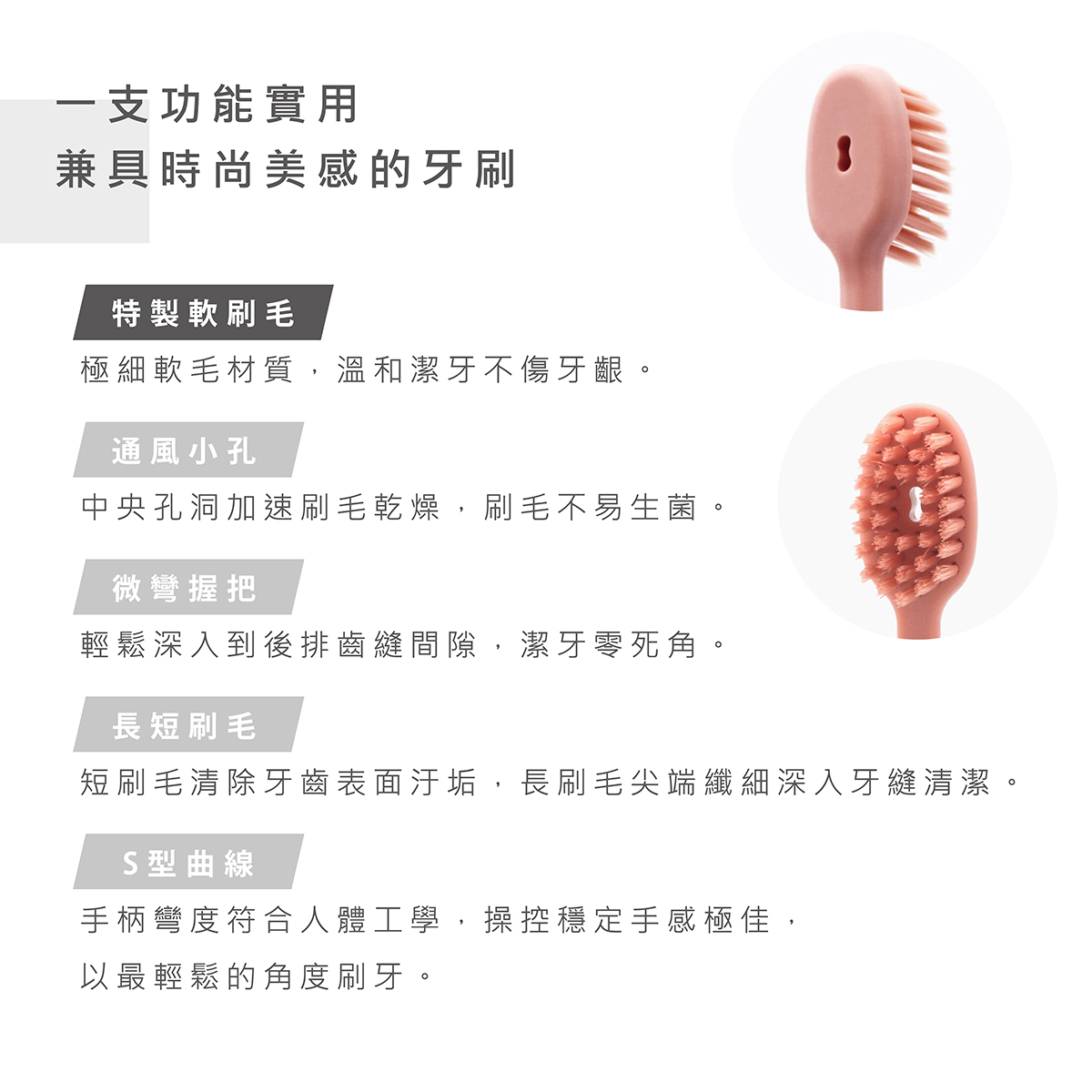 中央孔洞加速刷毛乾燥.S型曲線設計,方便深入口腔,輕鬆潔牙零死角.