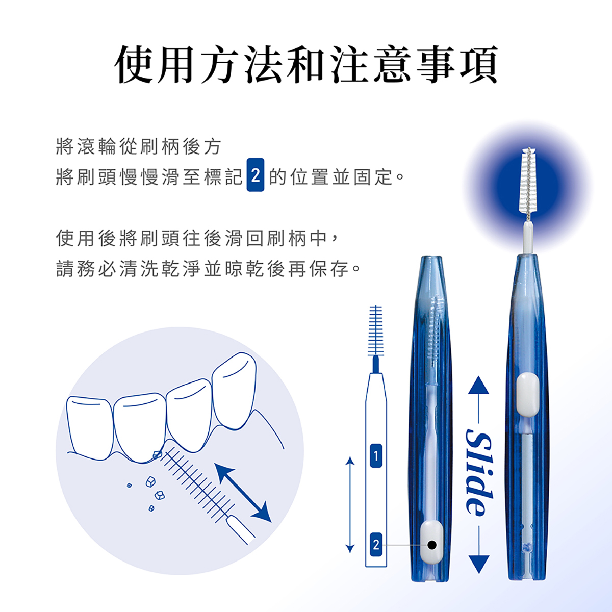 1.請選擇適用尺寸型號齒間刷.使用中請勿旋轉刷頭.