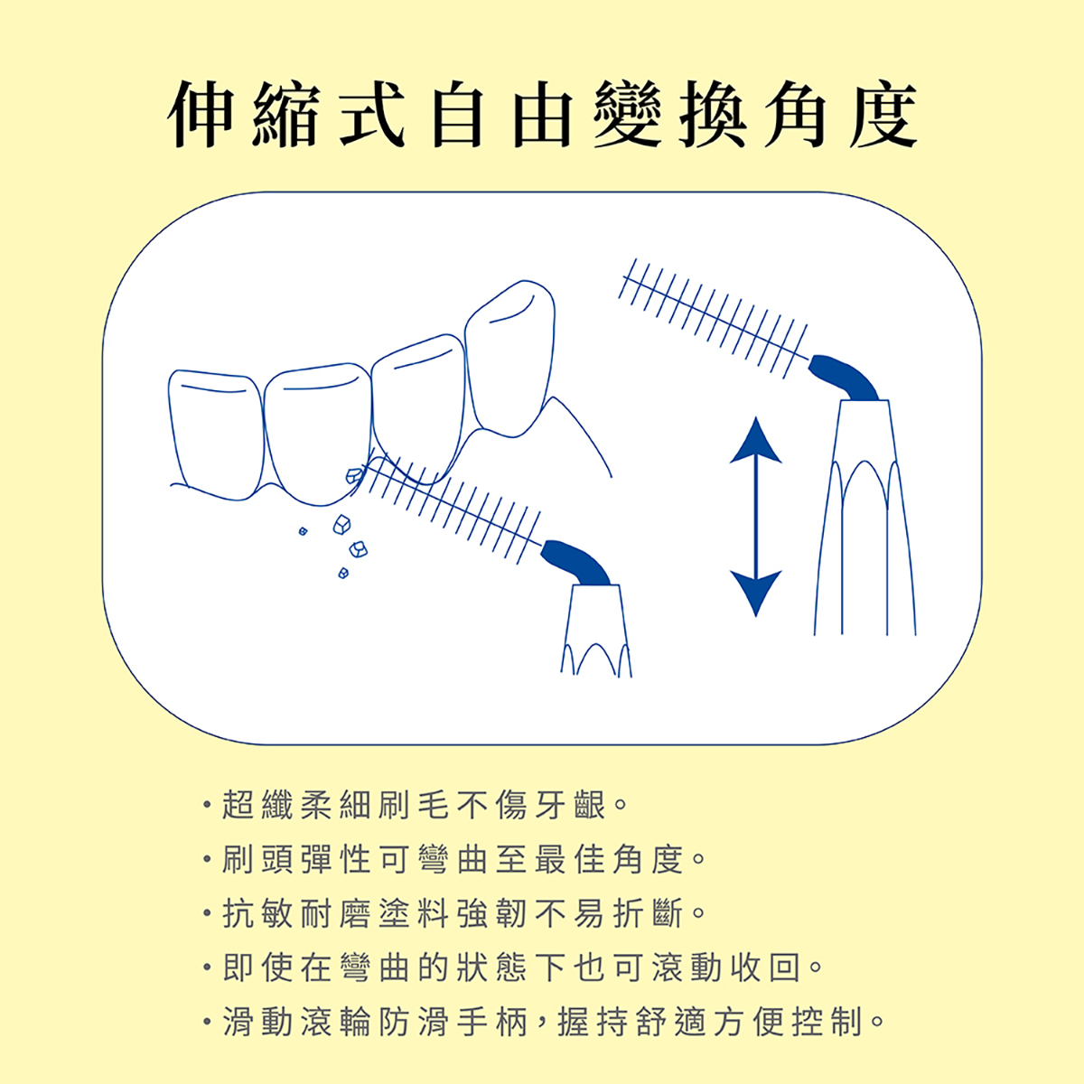特點:伸縮式可多角度彎折,附滑動滾輪,方便收納到刷柄中,乾淨衛生.超纖柔細刷毛不傷牙齦,刷頭頸部強化彈力樹脂,可彎曲任意角度,齒縫間隙零死角清潔.