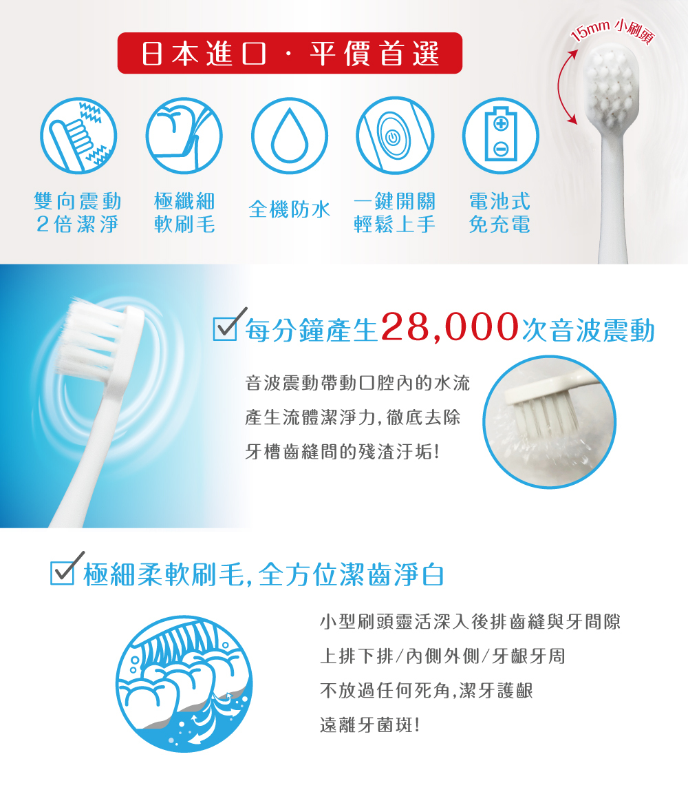 1.音波震動,每分鐘震動約28000次,溫和適中不傷牙齒。