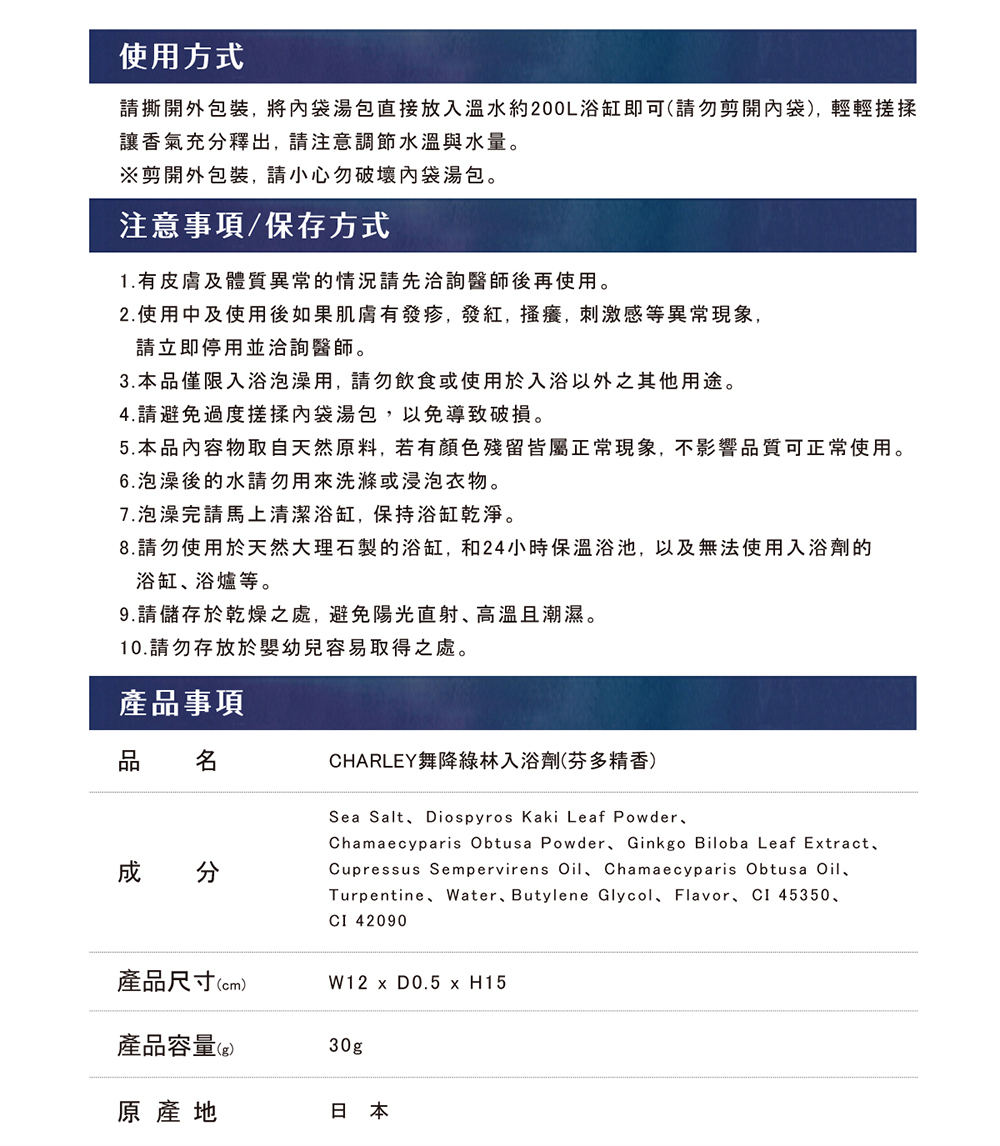 【品名】CHARLEY 舞降綠林入浴劑 30g