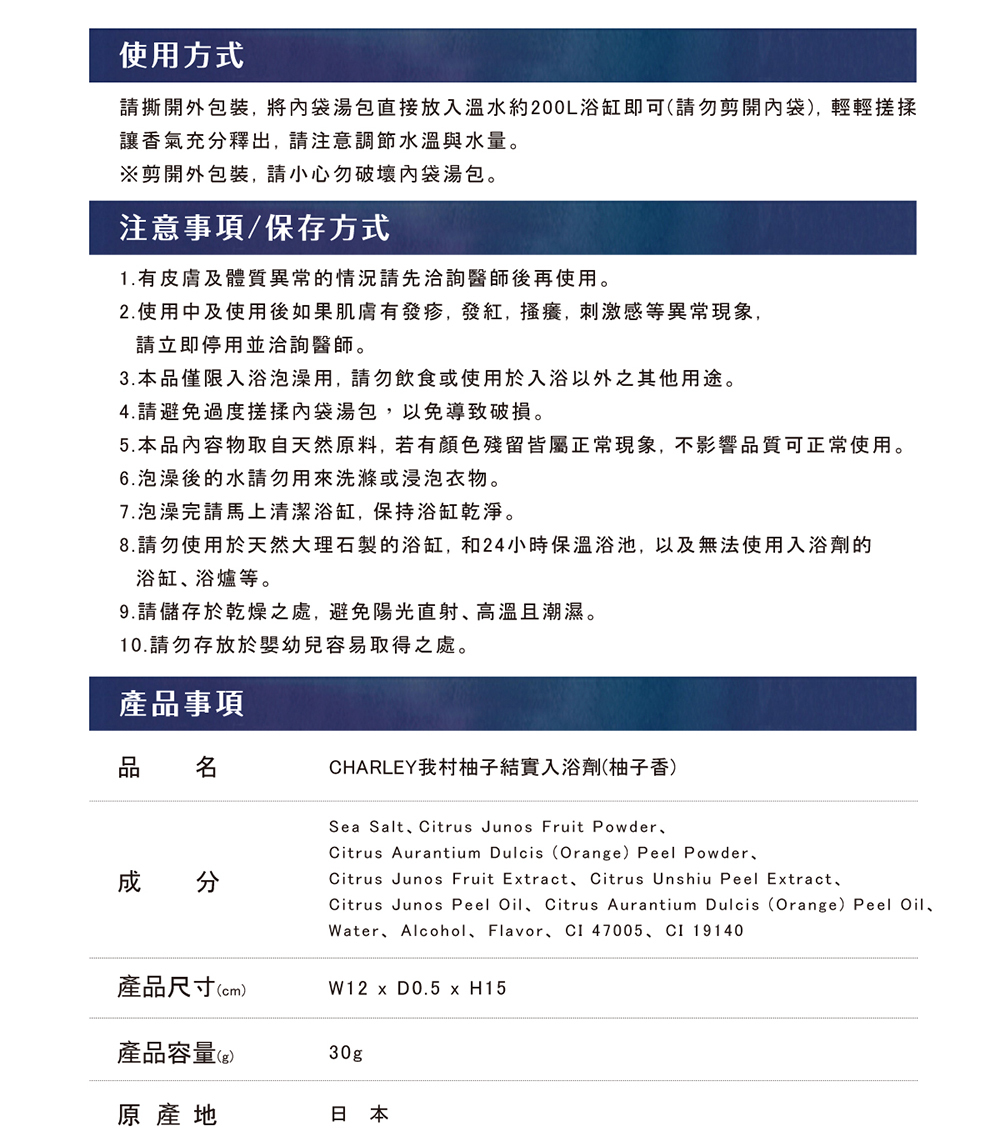 【品名】CHARLEY 我村柚子結實入浴劑(柚子香) 30g