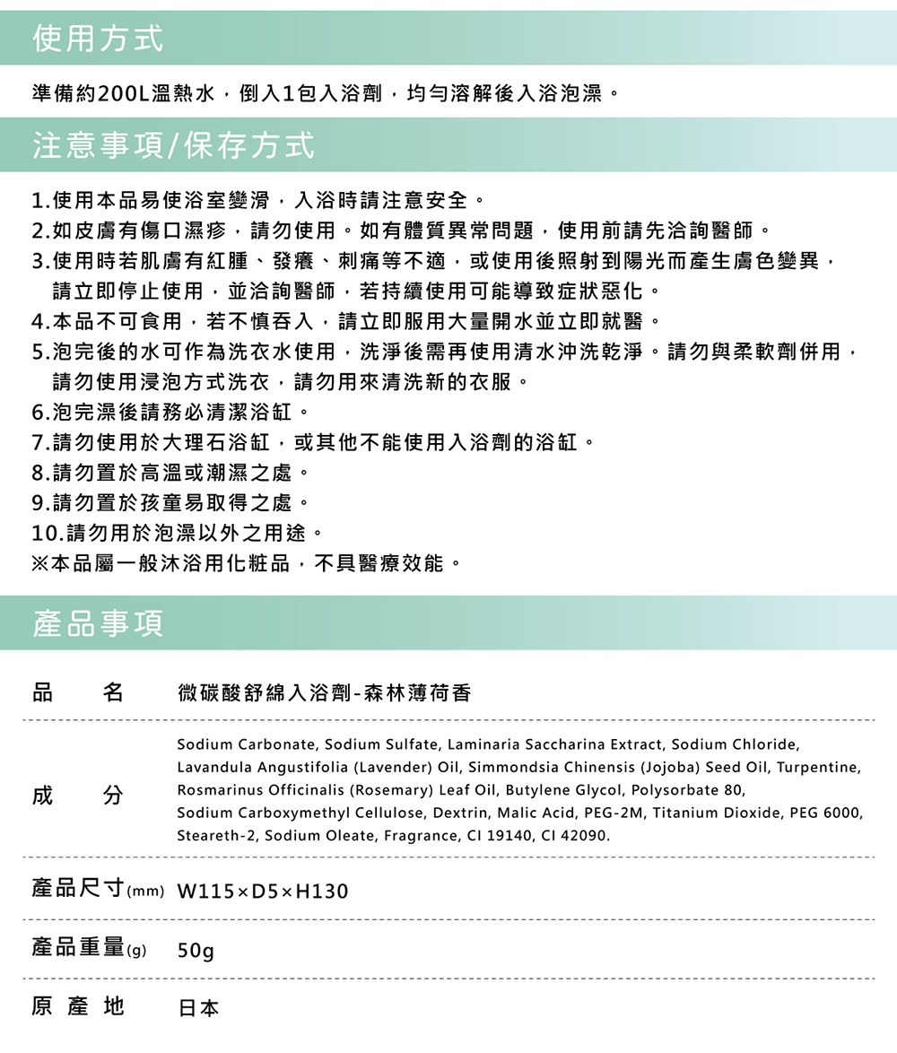 【品名】CHARLEY 微碳酸舒綿入浴劑-森林薄荷香/50g
