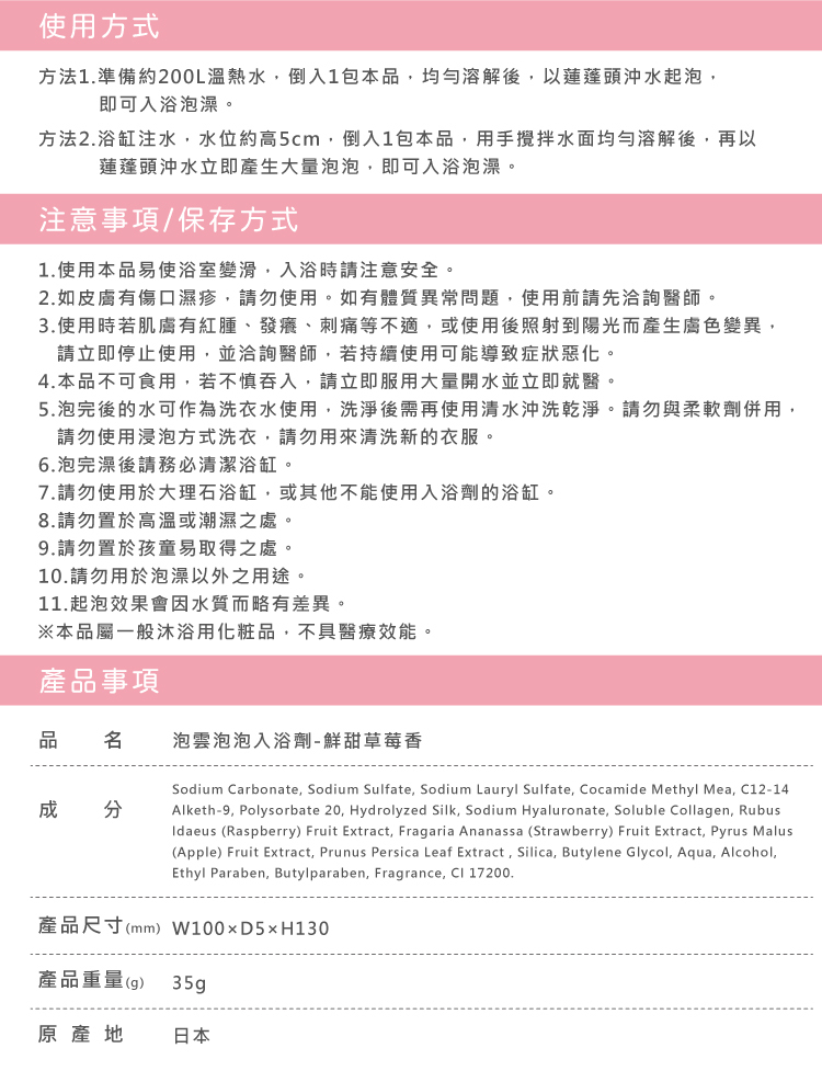 有如被雲朵包圍的鬆軟泡泡浴,夢幻般的入浴時光.☆含潤澤成分-水解蠶絲蛋白.玻尿酸.膠原蛋白.☆植萃成分-覆盆子果萃取.草莓萃取.蘋果果實精華.桃葉萃取,給予肌膚保濕水嫩.☆鮮甜草莓香氣&清透粉紅湯色