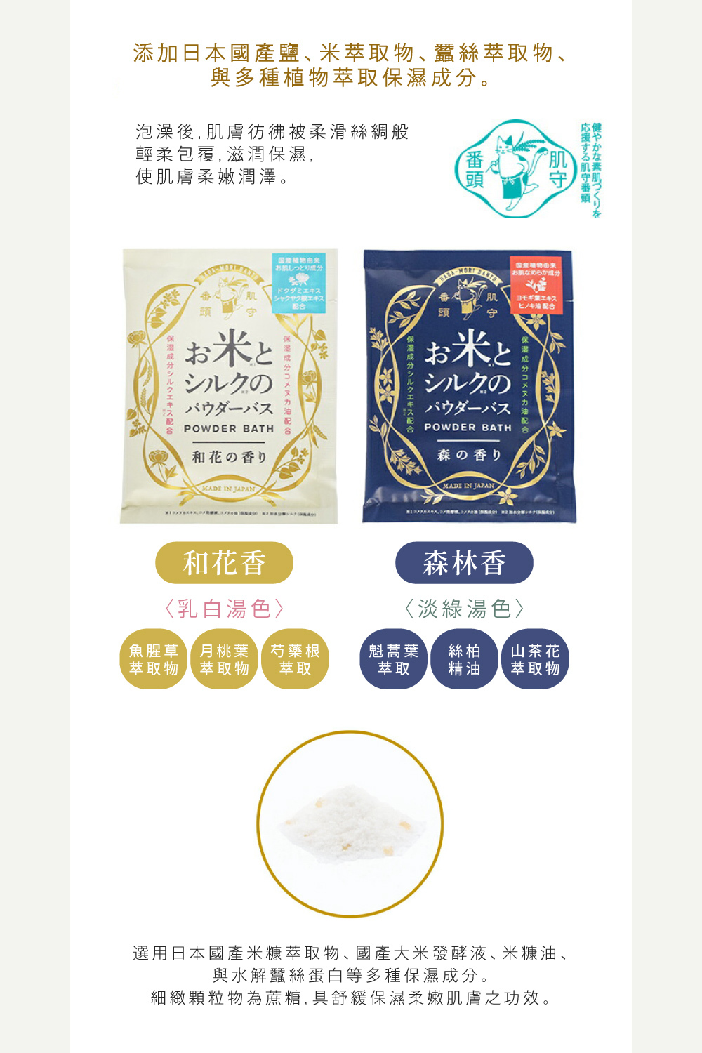 添加鹽與米萃取成分,蠶絲蛋白精華,植物萃取保濕成分.