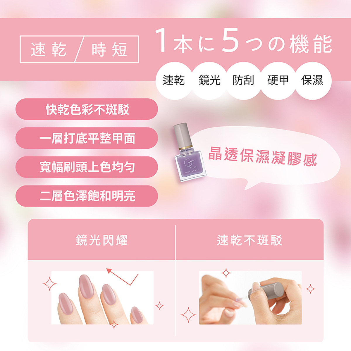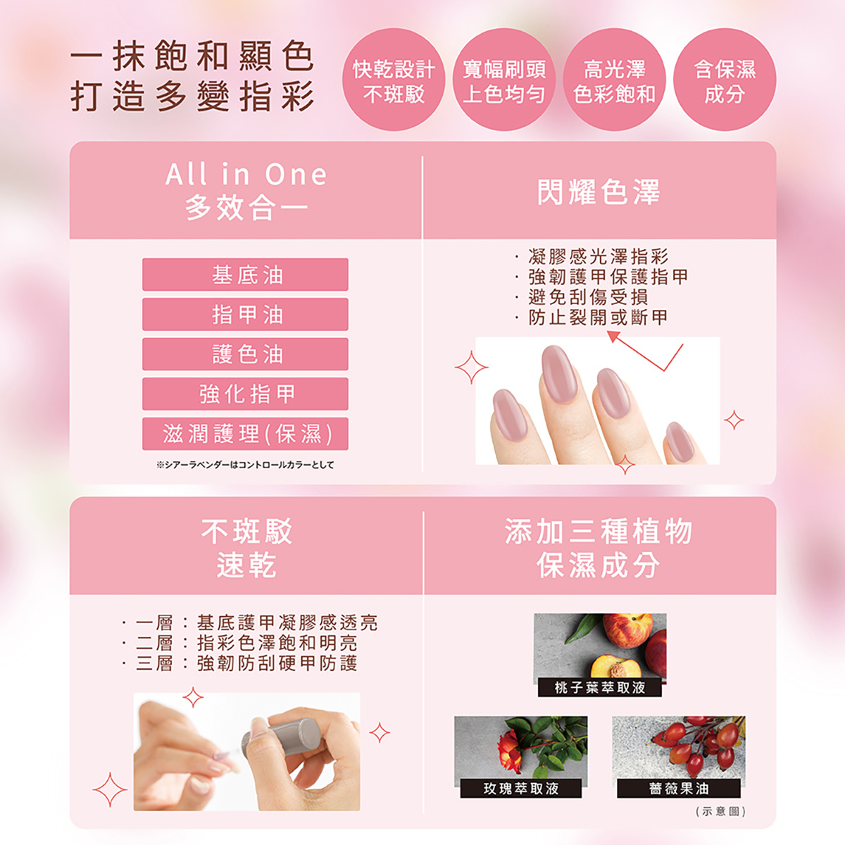 五效合一:基底油,指甲油,護色油,強化指甲,滋潤護理.