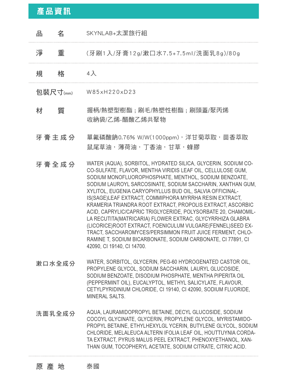 【全成分】牙膏主成分: 單氟磷酸鈉0.76% W/W(1000ppm),洋甘菊萃取,茴香萃取,鼠尾草油,薄荷油,丁香油,甘草,蜂膠.牙膏全成分: WATER (AQUA), SORBITOL, HYDRATED SILICA, GLYCERIN, SODIUM COCO-SULFATE, FLAVOR, MENTHA VIRIDIS LEAF OIL, CELLULOSE GUM, SODIUM MONOFLUOROPHOSPHATE, MENTHOL, SODIUM BENZOATE, SODIUM LAUROYL SARCOSINATE, SODIUM SACCHARIN, XANTHAN GUM, XYLITOL, EUGENIA CARYOPHYLLUS BUD OIL, SALVIA OFFICINALIS(SAGE)LEAF EXTRACT, COMMIPHORA MYRRHA RESIN EXTRACT, KRAMERIA TRIANDRA ROOT EXTRACT, PROPOLIS EXTRACT, ASCORBIC ACID, CAPRYLIC/CAPRIC TRIGLYCERIDE, POLYSORBATE 20, CHAMOMILLA RECUTITA(MATRICARIA) FLOWER EXTRAC, GLYCYRRHIZA GLABRA (LICORICE)ROOT EXTRACT, FOENICULUM VULGARE(FENNEL)SEED EXTRACT, SACCHAROMYCES/PERSIMMON FRUIT JUICE FERMENT, CHLORAMINE T, SODIUM BICARBONATE, SODIUM CARBONATE, CI 77891, CI 42090, CI 19140, CI 14700.漱口水全成分: WATER, SORBITOL, GLYCERIN, PEG-60 HYDROGENATED CASTOR OIL, PROPYLENE GLYCOL, SODIUM SACCHARIN, LAURYL GLUCOSIDE, SODIUM BENZOATE, DISODIUM PHOSPHATE, MENTHA PIPERITA OIL (PEPPERMINT OIL), EUCALYPTOL, METHYL SALICYLATE, FLAVOUR, CETYLPYRIDINIUM CHLORIDE, CI 19140, CI 42090, SODIUM FLUORIDE, MINERAL SALTS.洗面乳全成分: AQUA, LAURAMIDOPROPYL BETAINE, DECYL GLUCOSIDE, SODIUM COCOYL GLYCINATE, GLYCERIN, PROPYLENE GLYCOL, MYRISTAMIDOPROPYL BETAINE, ETHYLHEXYLGL YCERIN, BUTYLENE GLYCOL, SODIUM CHLORIDE, MELALEUCA ALTERN IFOLIA LEAF OIL, HOUTTUYNIA CORDATA EXTRACT, PYRUS MALUS PEEL EXTRACT, PHENOXYETHANOL, XANTHAN GUM, TOCOPHERYL ACETATE, SODIUM CITRATE, CITRIC ACID.