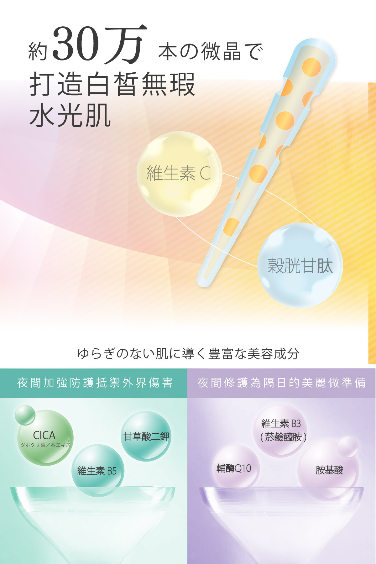 Water, Propylene Glycol, Glycerin, Hydroxyacetophenone, Phenoxyethanol, Carbomer, Dipotassium Glycyrrhizate, Panthenol, Niacinamide, PEG-60 Hydrogenated Castor Oil, Butylene Glycol, Hydrolyzed Sponge, Tocopheryl Acetate, 3-O-Ethyl Ascorbic Acid, Ascorbyl Glucoside, Ascorbyl Tetraisopalmitate, Trisodium Ascorbyl Palmitate Phosphate, Sodium Hyaluronate, Citric Acid, Sodium Citrate, Potassium Hydroxide, Taurine, Centella Asiatica Leaf/Stem Extract, Alcohol, Phytosteryl/Octyldodecyl Lauroyl Glutamate, Lysine HCl, Alanine, Histidine HCl, Arginine, Serine, Lecithin, Proline, Calcium Silicate, Glutamic Acid, Threonine, Valine, Leucine, 1,2-Hexanediol, Glycine, Sodium Silicate, Hydrogenated Lecithin, Allantoin, Isoleucine, Phenylalanine, Arbutin, Polyglyceryl-10 Laurate, Ubiquinone, Palmitic Acid, Glutathione, Linoleic Acid, Linolenic Acid, Ascorbyl Palmitate.