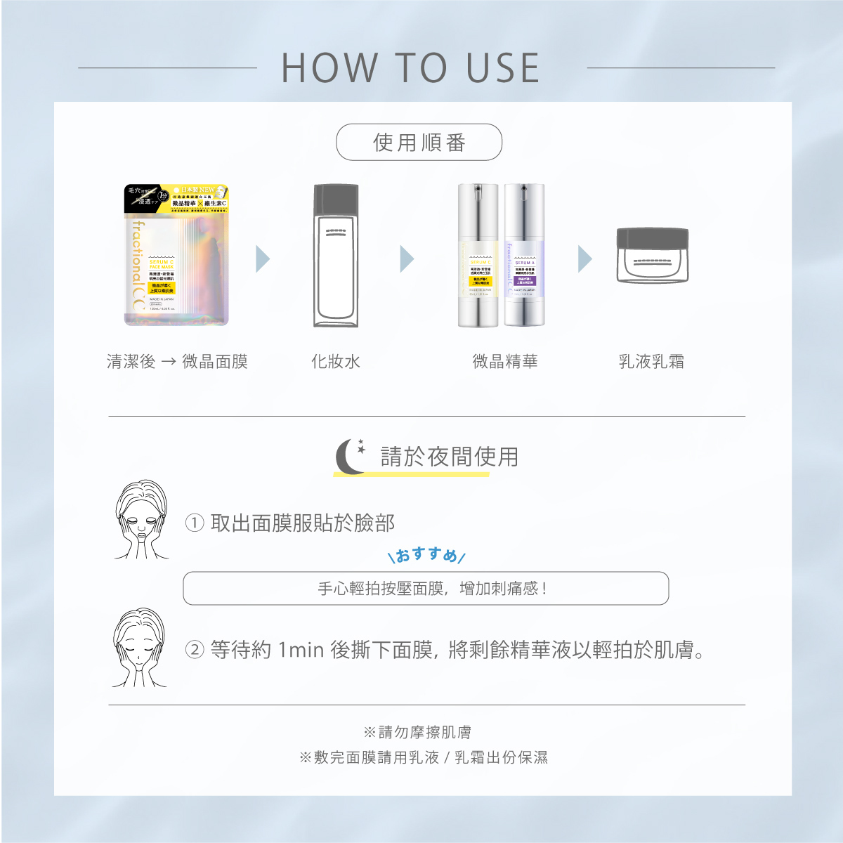 使用方法: 1.請在夜間洗臉後的清潔肌膚上使用.取出面膜,調整好眼睛,鼻子和嘴巴的位置,然後將面膜緊密貼合於整個臉部.2.等待約1分鐘後,將面膜取下.3.將剩餘的精華液,以手掌輕輕按摩至肌膚後,使用乳液和面霜等,充分保濕護理肌膚.