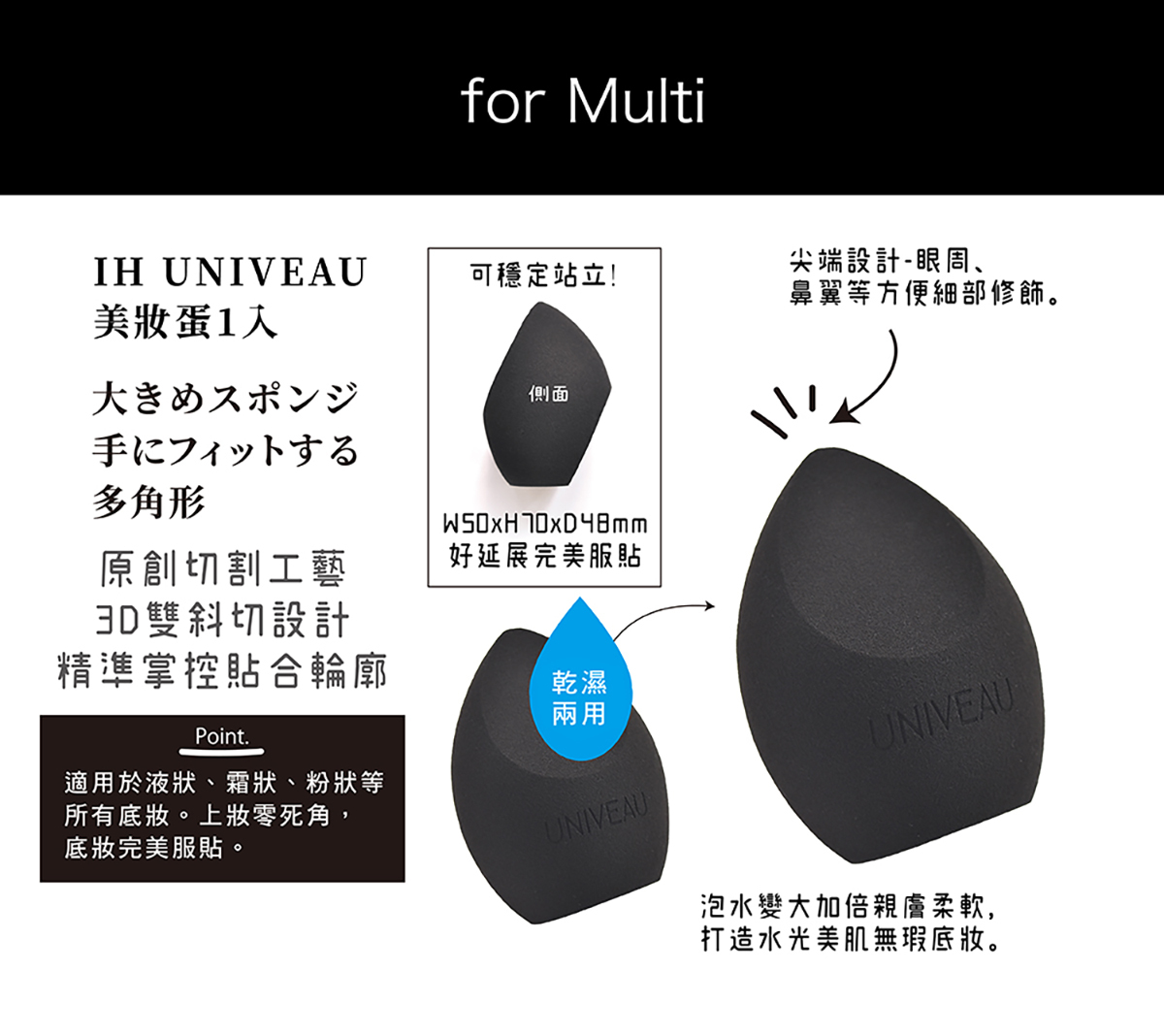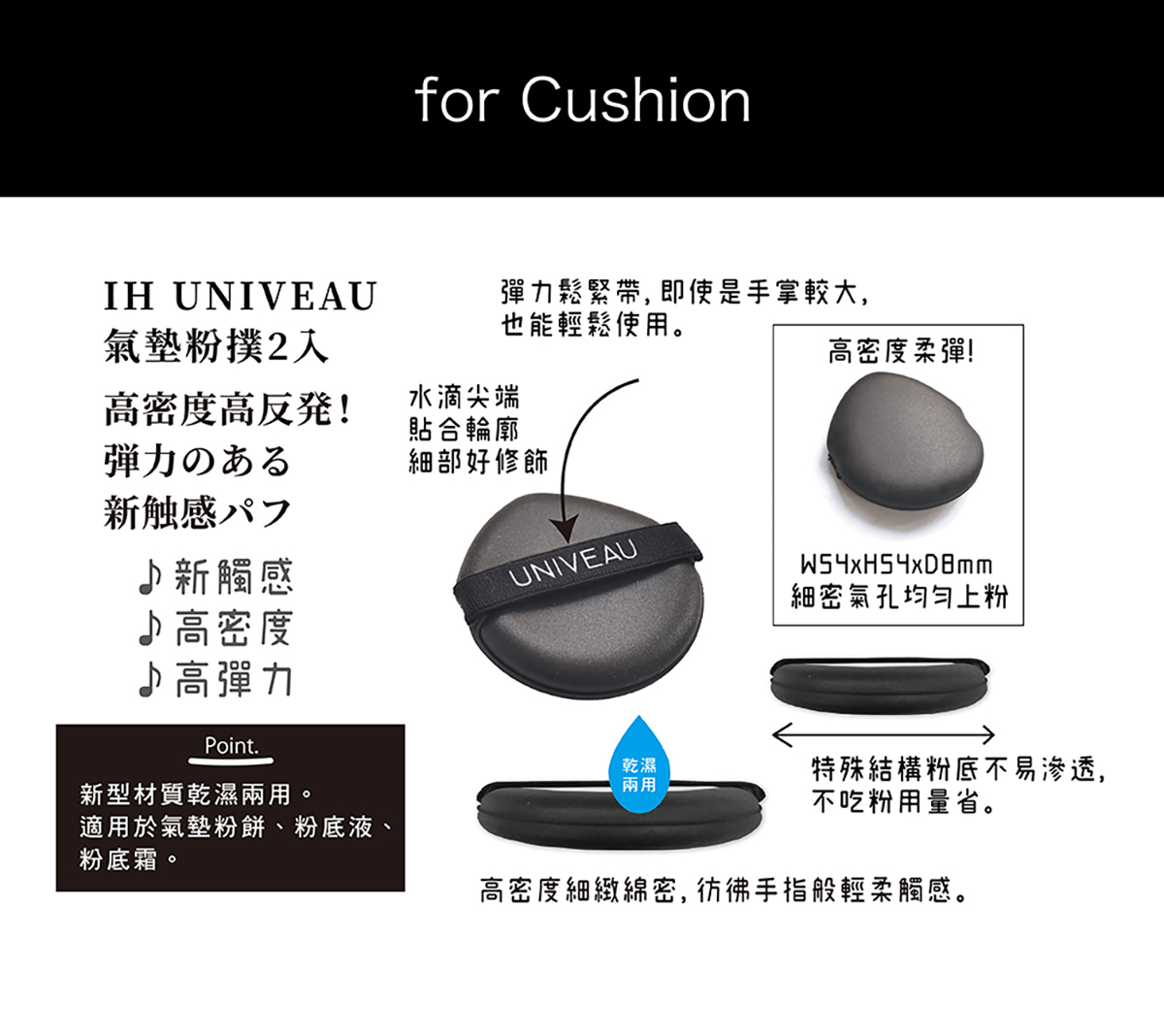 新型材質乾濕兩用,新觸感細緻綿密,高密度高彈力,貼合臉部曲線,彷彿手指般輕柔觸感,打造無瑕妝感