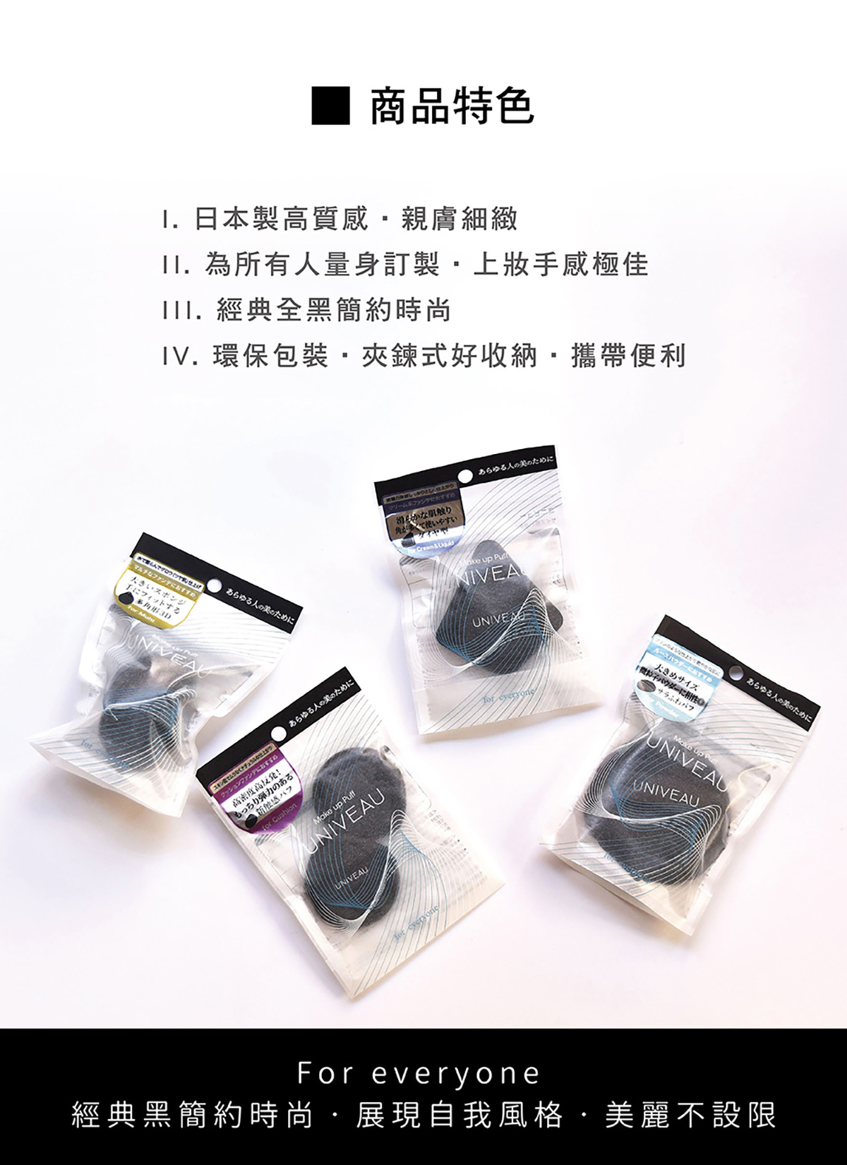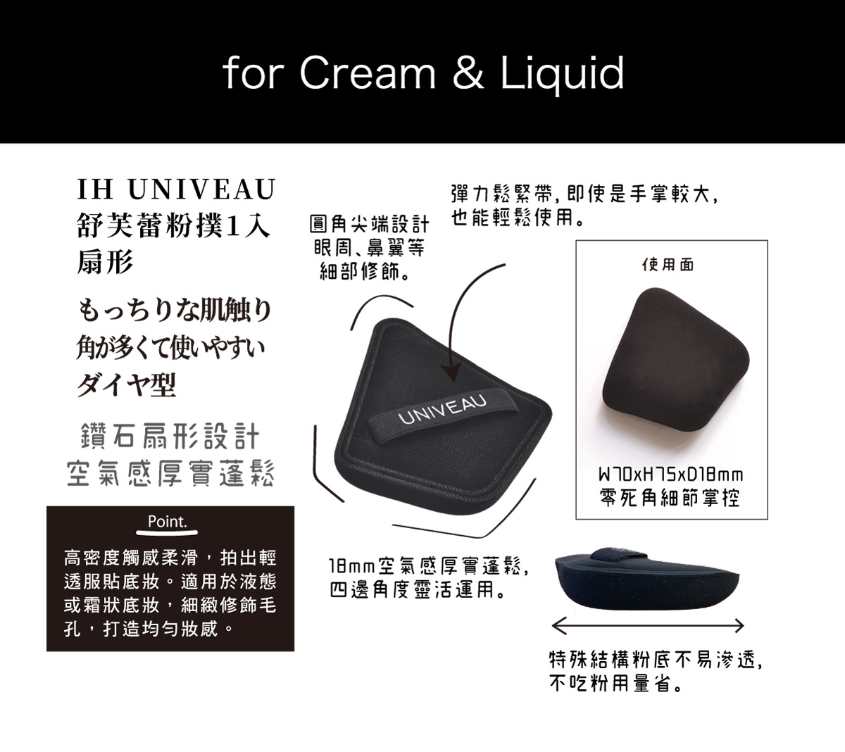 特點:新型材質乾濕兩用,新觸感細緻綿密,高密度高彈力,貼合臉部曲線,彷彿手指般輕柔觸感,打造無瑕妝感.特殊結構粉底不易滲透,不吃粉用量省.水滴型尖端設計,貼合輪廓方便細部修飾.採用鬆緊帶設計,即使是手掌較大的人也能輕鬆使用.搭配氣墊粉餅效果極佳.