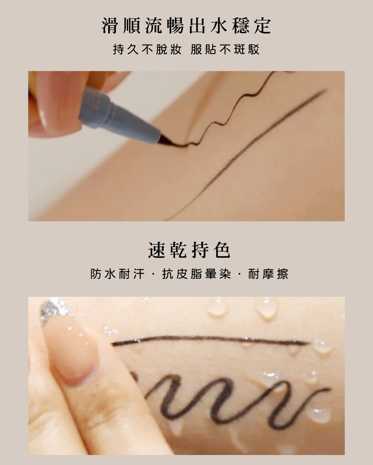 使用方法: 使用前請先輕輕上下搖晃2-3次.沿睫毛根部與眼瞼弧度延伸方向,向眼尾細緻勾勒線條.※初次使用或出水不順時,請保持瓶蓋閉合搖晃,將瓶身倒置靜置數分鐘,並於手背或面紙上試畫至筆尖流暢.※使用後請擦拭筆尖殘留液體,務必確實緊閉瓶蓋.