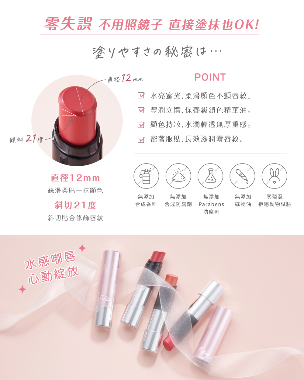 【特點】不用鏡子也能快速打造令人心動的雙唇!直徑12mm,傾斜21度完美貼合雙唇,質地滑順,隨時隨地輕鬆塗抹.含美容保濕成分,同時進行唇部護理,讓雙唇飽滿有彈性. ※實際妝效因人而異.