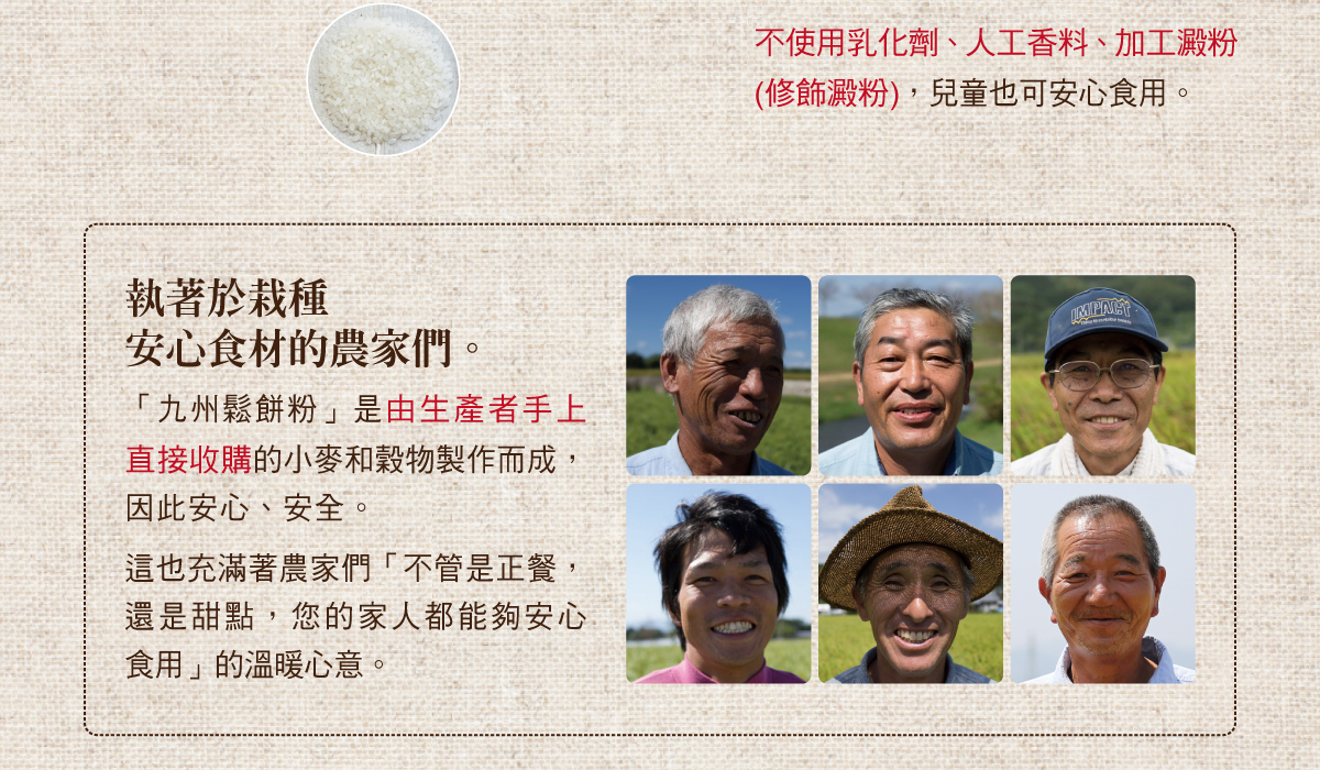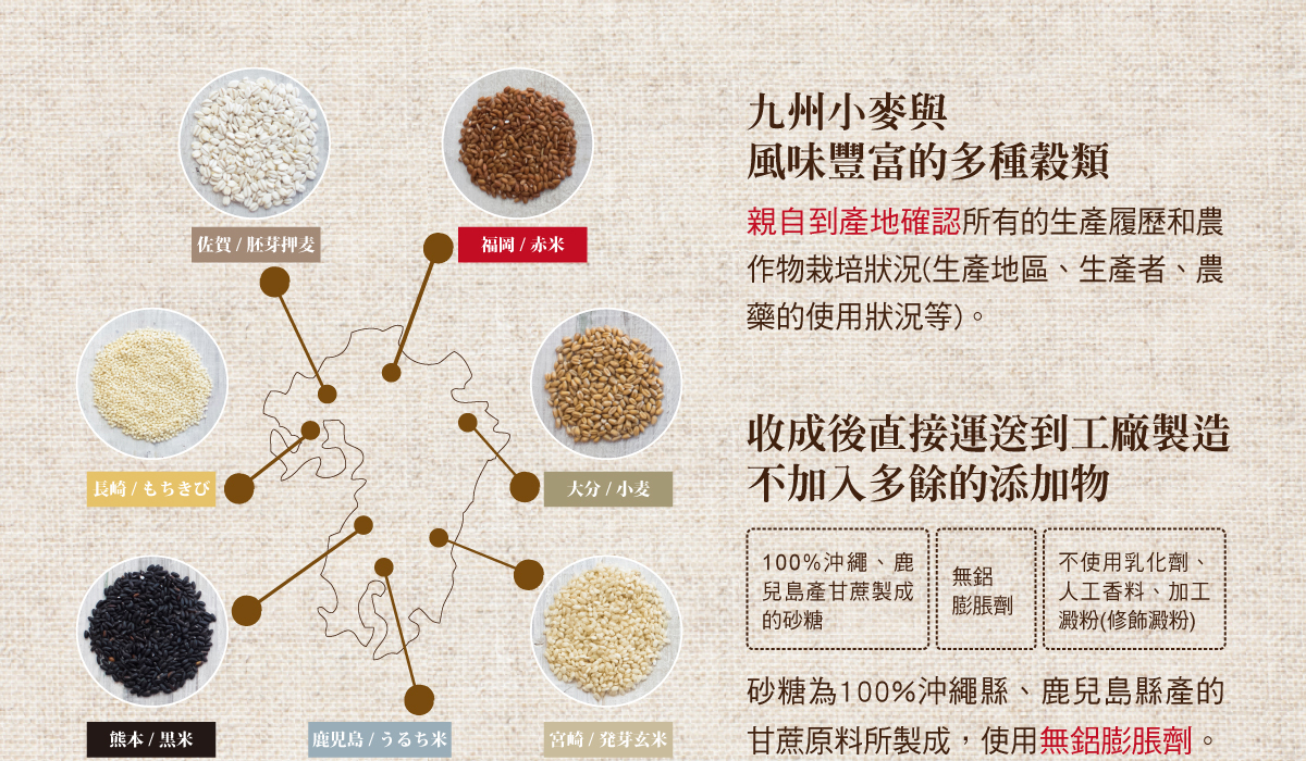 嚴選九州特色七種穀物,小麥粉(大分和其它九州縣市)、砂糖(沖繩,鹿兒島)、紅糯米(福岡)、胚芽押麥(佐賀)、糯黍(長崎)、紫米(熊本)、粳米(鹿兒島)、發芽玄米(宮崎)。